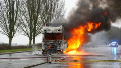 Vrachtwagen krijgt klapband op snelweg en belandt in de vangrail