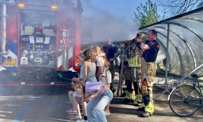 Buitenbrand snel geblust, kinderen op de foto met brandweer