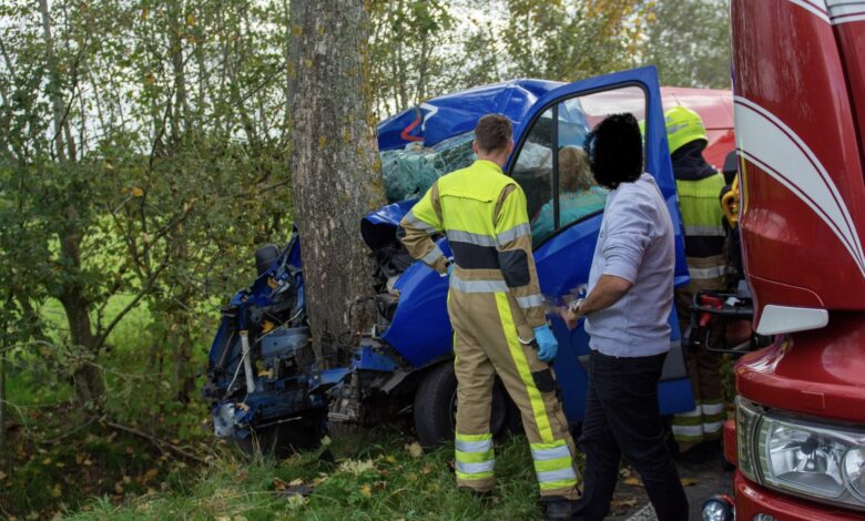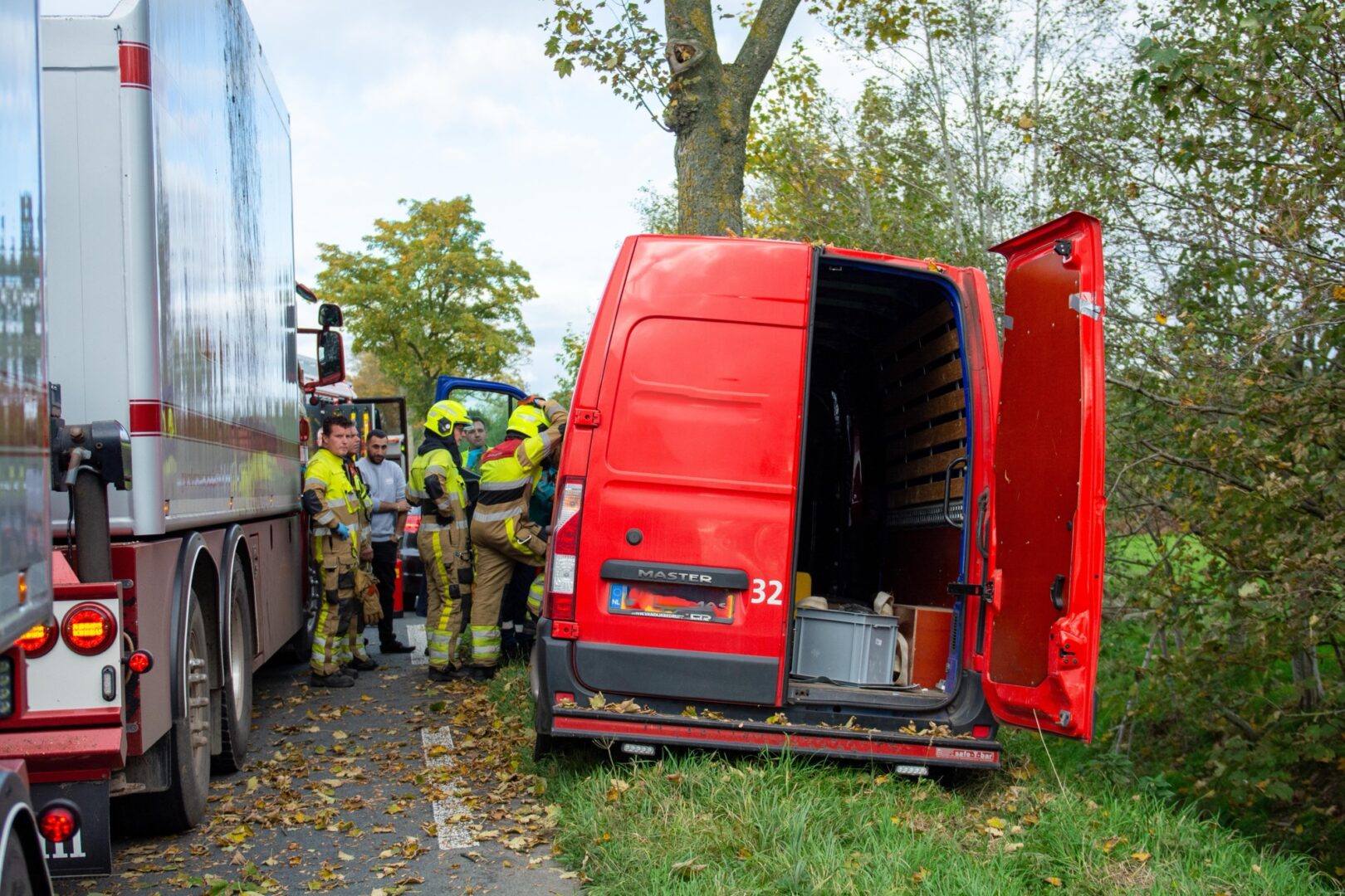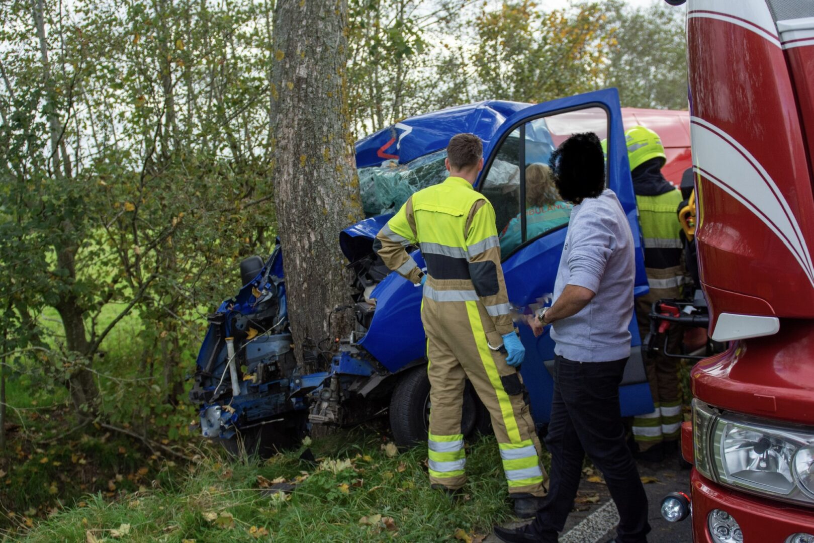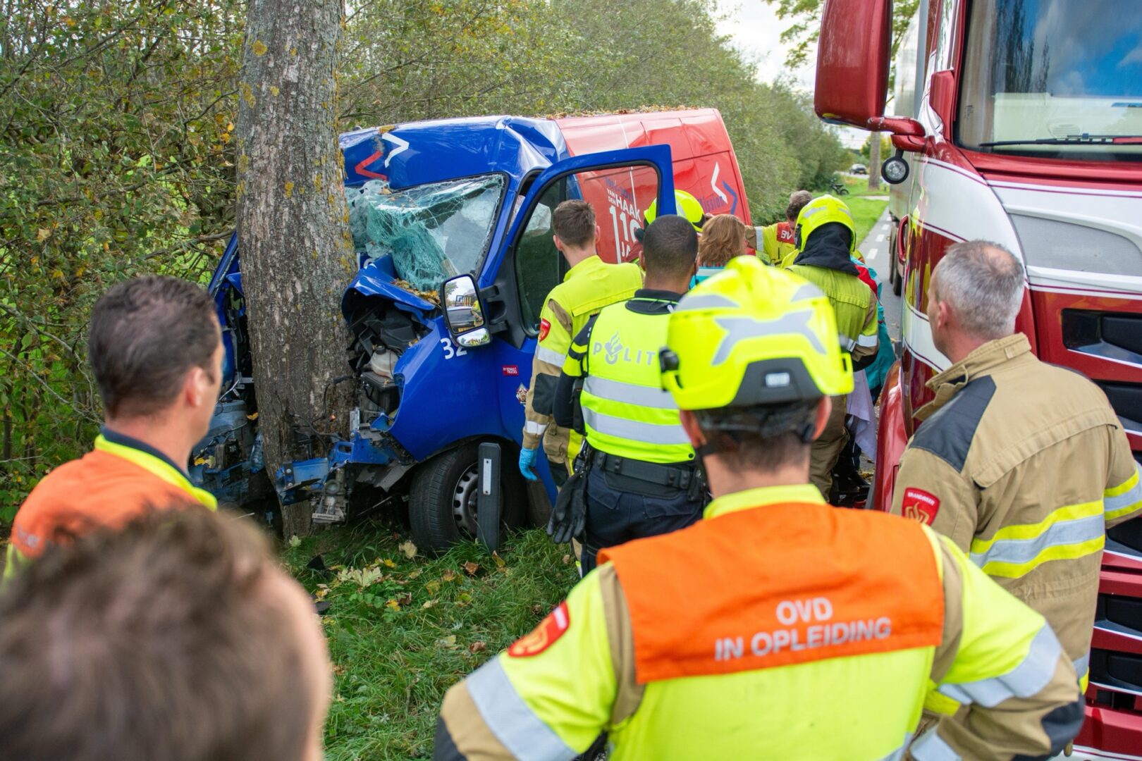 Zwaar frontaal ongeval, bestelbus botst hard tegen boom