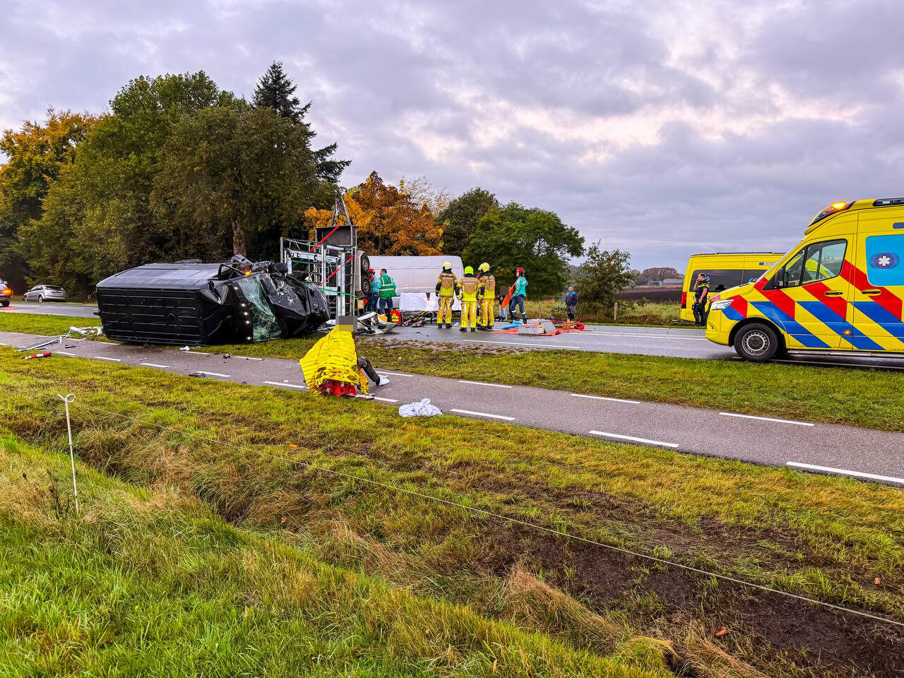 Het ongeluk gebeurde rond 07.30 uur. Door nog onbekende oorzaak kwamen de voertuigen met elkaar in aanrijding. Een bestelbus belandde door de harde klap op zijn zijkant.
