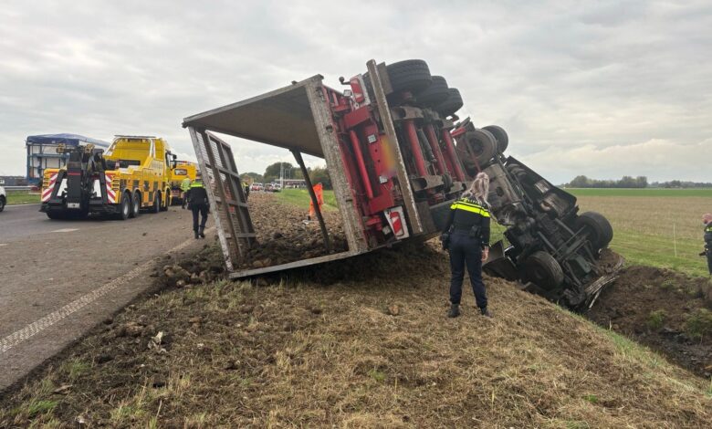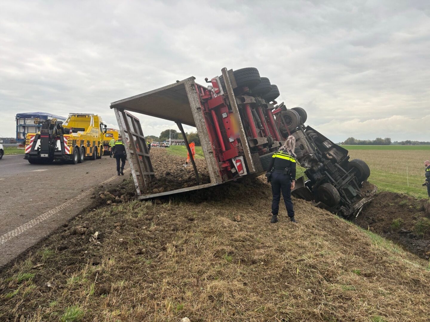 Vrachtwagen met suikerbieten belandt in sloot langs snelweg