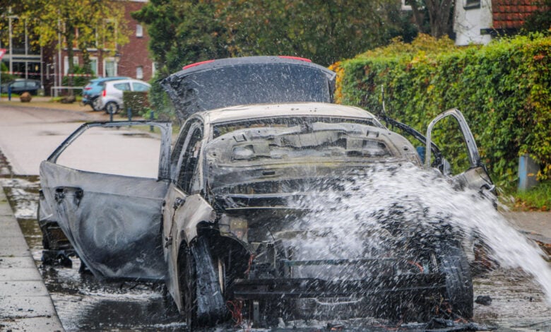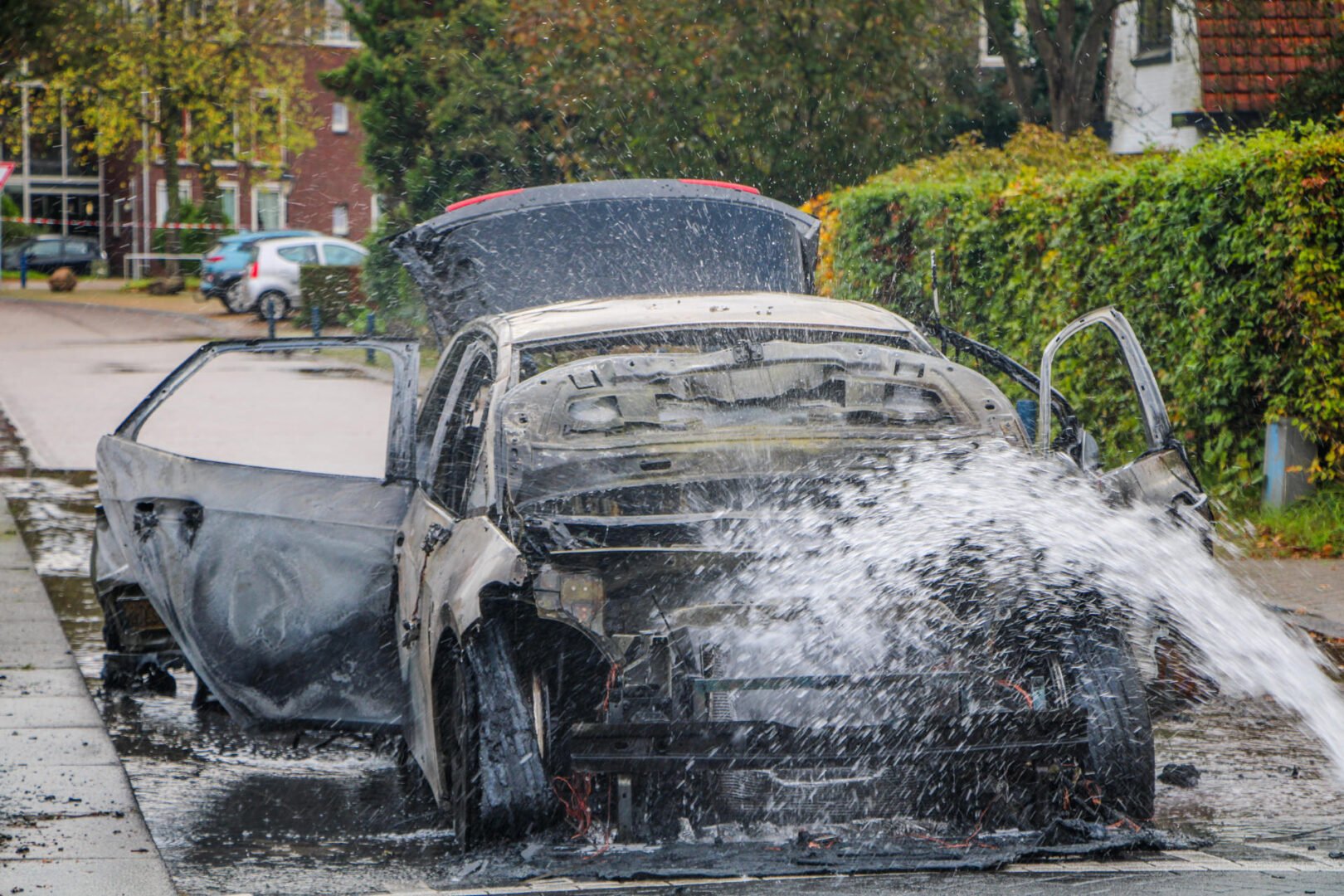 Elektrische auto vliegt in brand met meerdere personen in het voertuig
