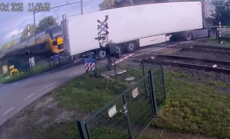 VIDEO | Beelden tonen hoe trein in volle vaart vrachtwagen schept op overgang