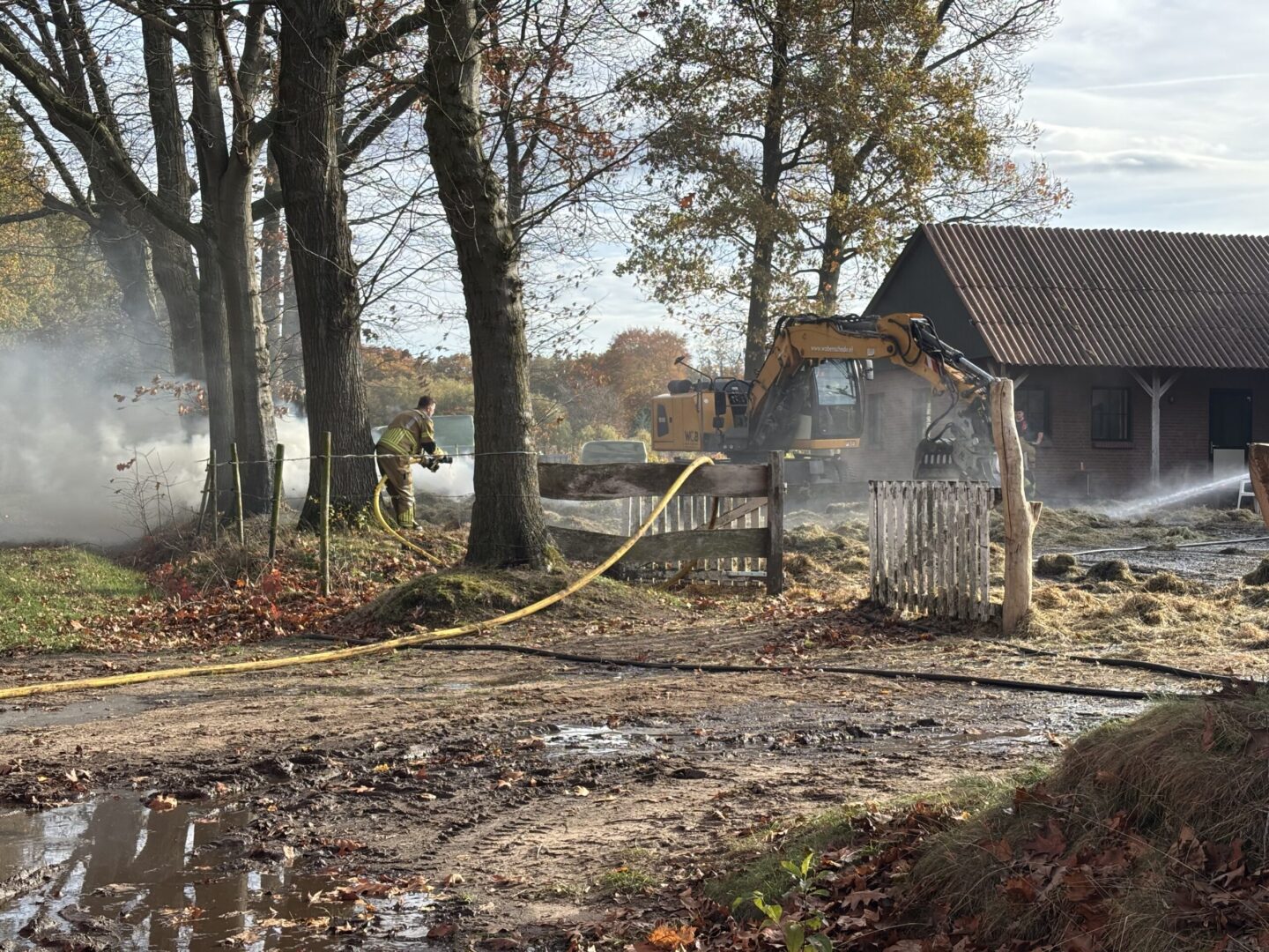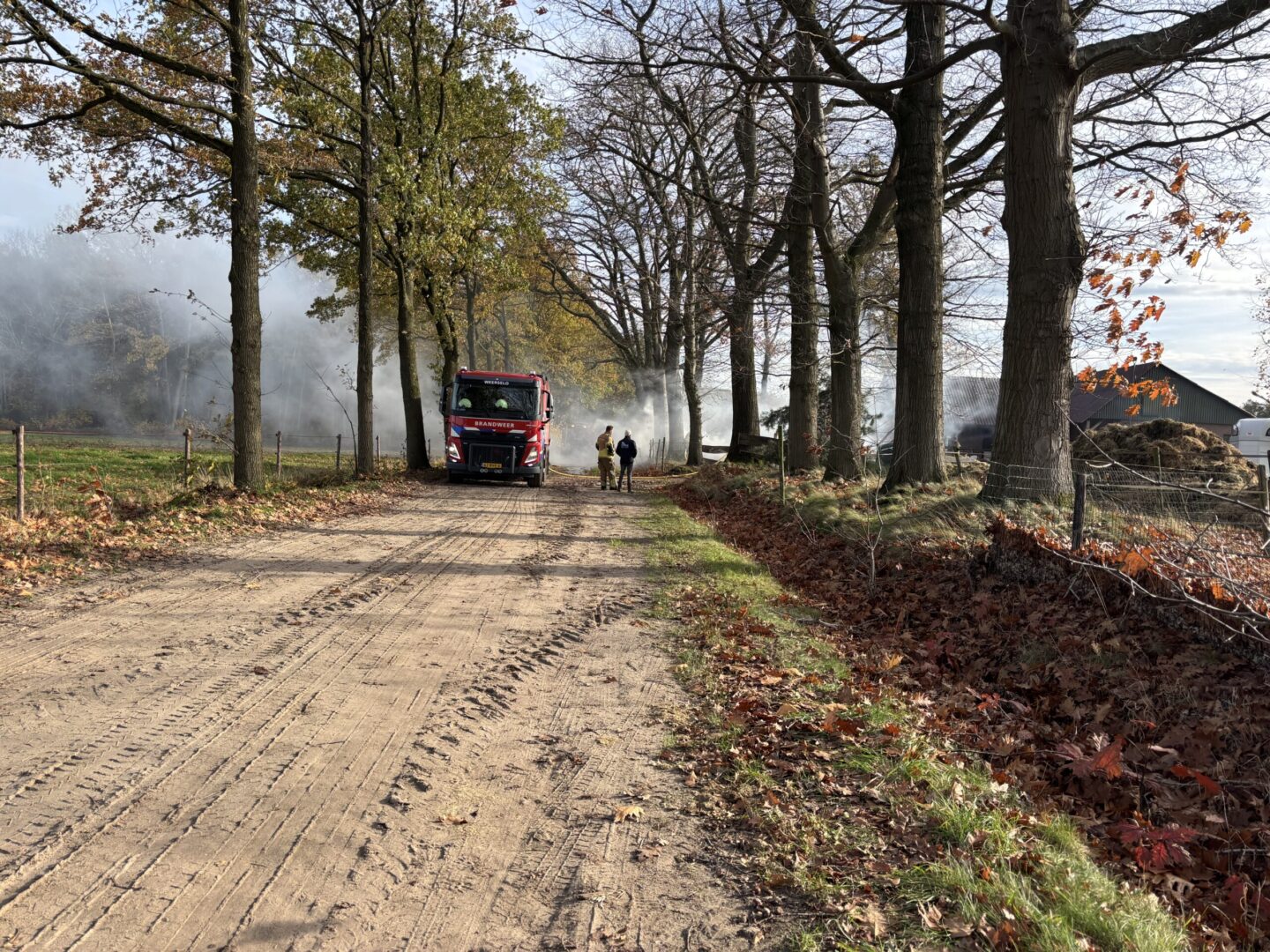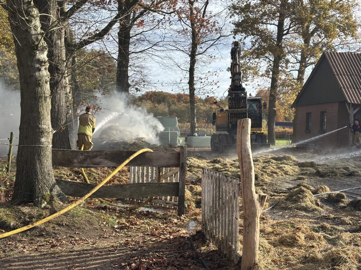 Hoewel er geen gevaar bestond voor uitbreiding en er daarom niet is opgeschaald, Denkt de brandweer nog zeker een paar uur nodig te hebben om de brand volledig onder controle te krijgen. Met een hijskraan wordt het hooi uit elkaar gehaald om alle resterende smeulende plekken beter te kunnen blussen.