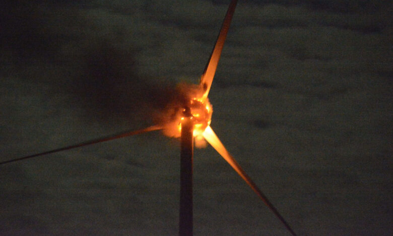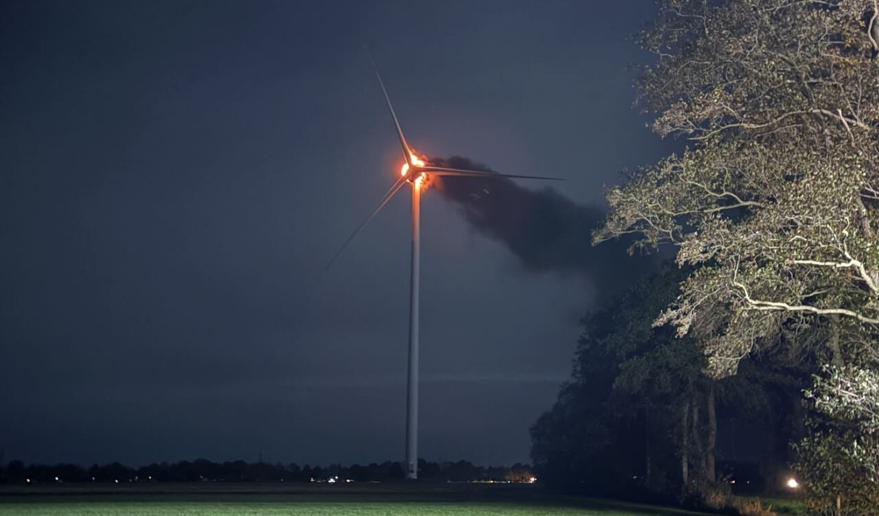 Hoe de brand in de 136 meter hoge windmolen kon ontstaan, is niet bekend.