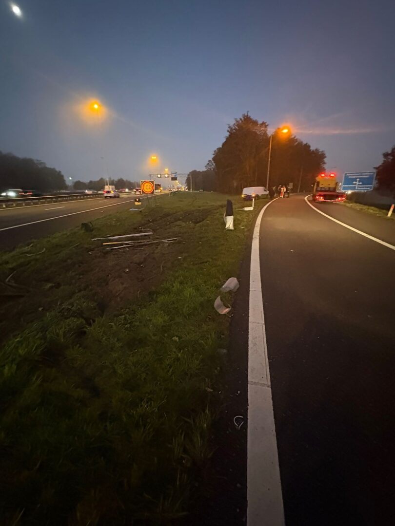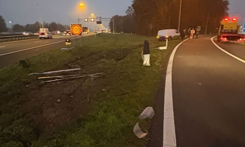 Het ongeval gebeurde rond 07:00 uur vanmorgen. De bestelbus reed op de A1 uit de richting van Apeldoorn en kwam naast de snelweg in de berm terecht. Onderweg heeft de bestelbus nog een lantaarnpaal uit de grond gereden.
