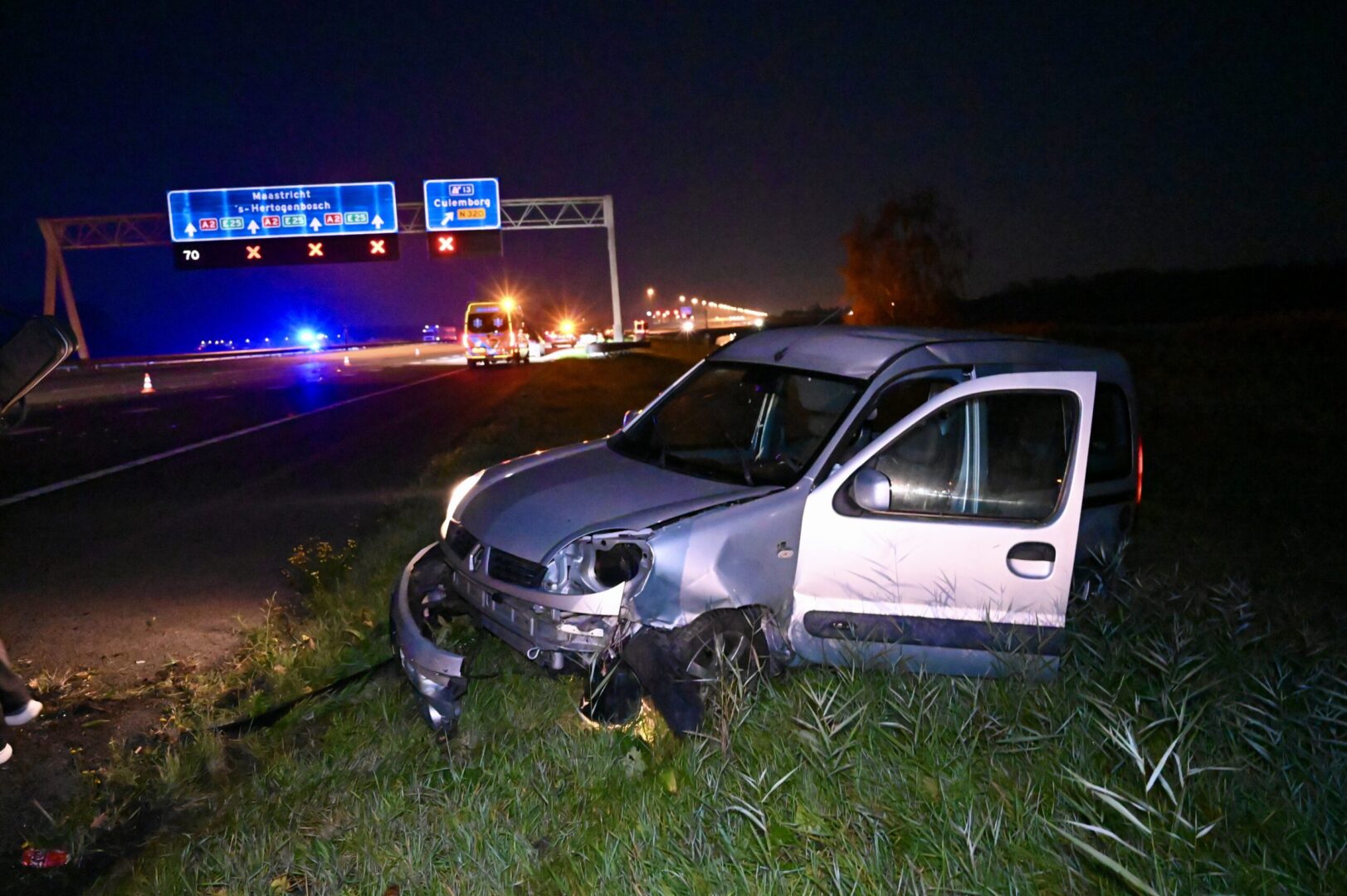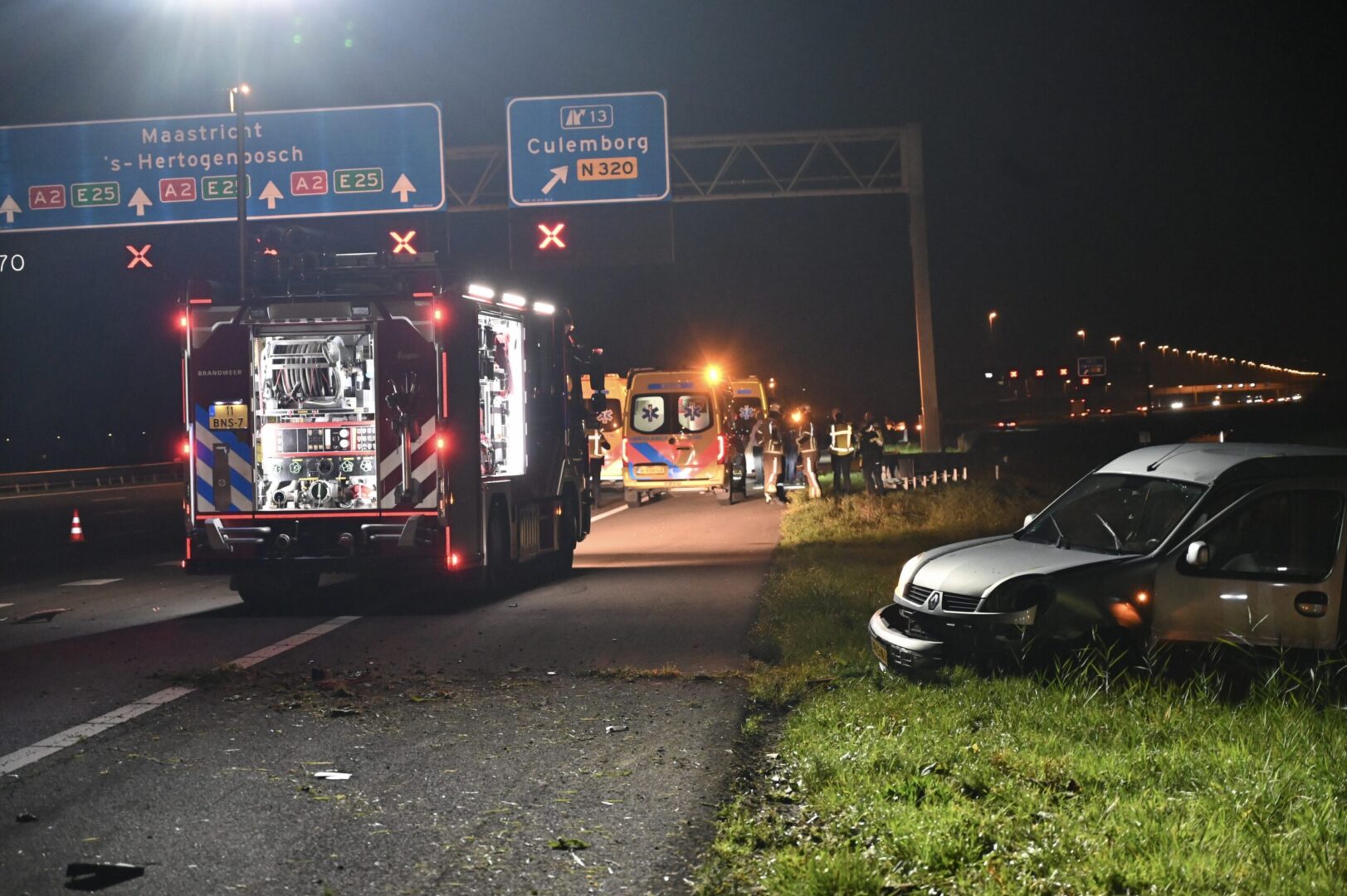De A2 is grotendeels afgesloten om de hulpdiensten de ruimte te geven hun werk te doen. Alleen de linkerbaan is nog open. Over de gehele rijbaan liggen brokstukken van het ongeval.