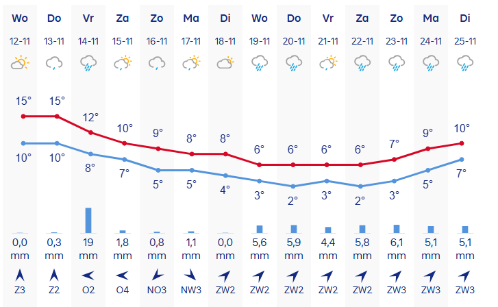 Donderdag verandert het weerbeeld: de bewolking neemt toe en de zon laat zich minder vaak zien. In het zuidoosten kan het met ongeveer 18 graden nog opvallend zacht worden voor november. Vrijdag staat vervolgens in het teken van regen — een groot deel van het land kan zich opmaken voor een kletsnatte dag waarbij de temperatuur al zakt naar de 10 graden.
