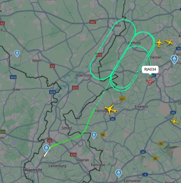 Het toestel, een Airbus A321-231 van Royal Jordanian Cargo, steeg om 17.13 uur op vanaf de luchthaven om te vliegen naar Amman, maar kreeg kort daarna te maken met technische problemen. Het toestel zou aanvankelijk weer gaan landen op de Limburgse luchthaven. Uit voorzorg werd er opgeschaald naar GRIP 1 en stonden meerdere hulpdiensten paraat.