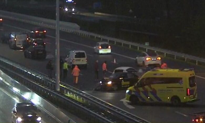 Hoe het ongeval precies kon ge beuren is niet bekend. Op beelden van Rijkswaterstaat is te zien hoe een van de betrokken auto’s overdwars op de snelweg staat. Twee rijstroken moesten worden afgesloten, waardoor de vertraging opliep tot ongeveer dertig minuten. Een ambulance werd met spoed opgeroepen.