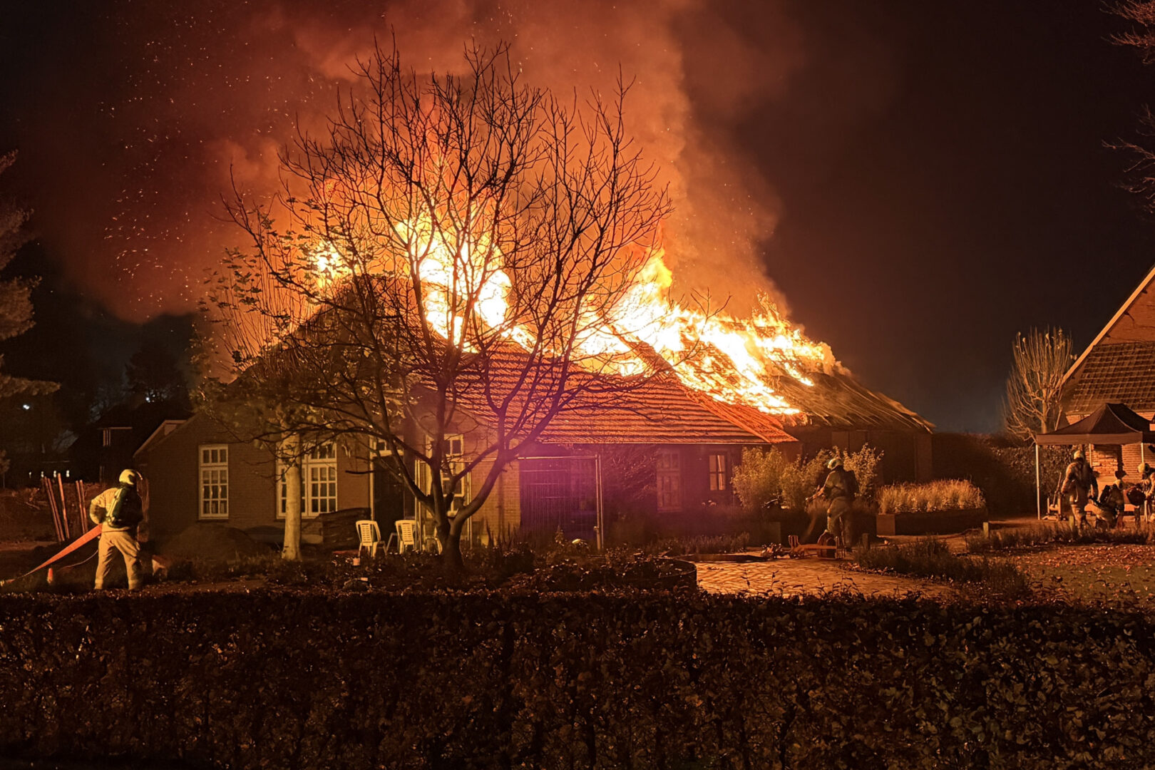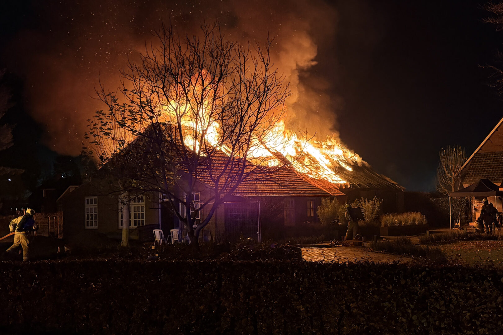 De brandweer werd met meerdere wagens gealarmeerd en al snel werd er opgeschaald naar het sein ‘middel brand’ waarna er meerdere brandweerwagens en een hoogwerker werden ingezet. Ook een watertankwagen is ingezet om voldoende bluswater ter plaatse te krijgen.