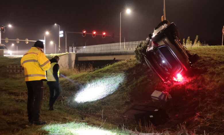 Het incident gebeurde kort na 01.50 uur. Een auto raakte door nog onbekende oorzaak van de weg, ramde een hekwerk en kwam enkele meters verderop op de zijkant in de berm tot stilstand. De bestuurder moest door de brandweer uit het voertuig worden bevrijd.