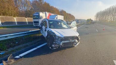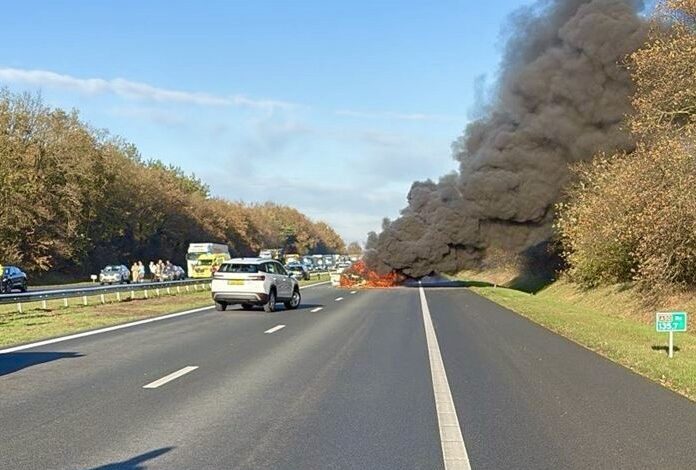 Snelweg dicht en 60 minuten file na ernstig ongeval, voertuig in brand gevlogen
