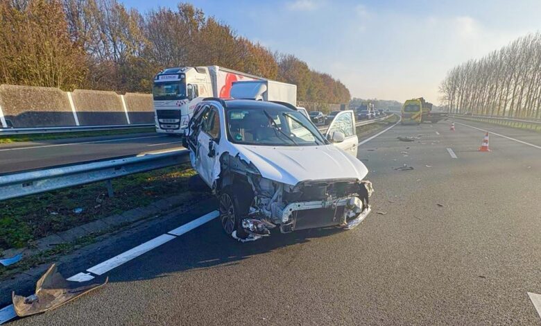 Daarnaast staat op de vluchtstrook een vrachtwagen met een klapband. Een zware bergingswagen is onderweg om het voertuig weg te halen.