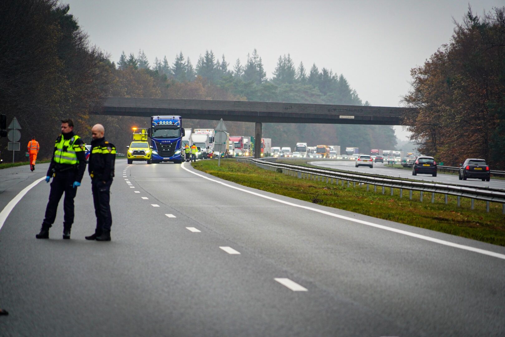De A50 is volledig afgesloten om ruimte te bieden voor de hulpverlening en het uitgebreide onderzoek dat door de politie wordt uitgevoerd. Het is nog niet bekend wanneer de weg weer vrij wordt gegeven.