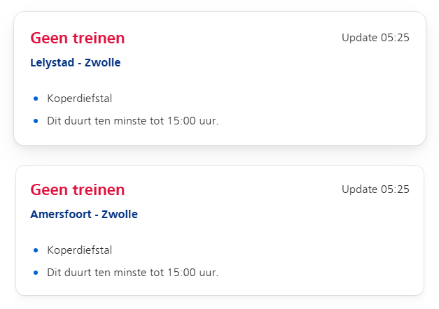 Reizigers tussen Amersfoort en Zwolle kunnen omreizen via Deventer, maar dat levert minimaal een half uur extra reistijd op. De spoorbeheerder benadrukt dat koperdiefstal niet alleen hoge kosten met zich meebrengt, maar ook groot veiligheidsrisico’s veroorzaakt voor zowel medewerkers als reizigers.