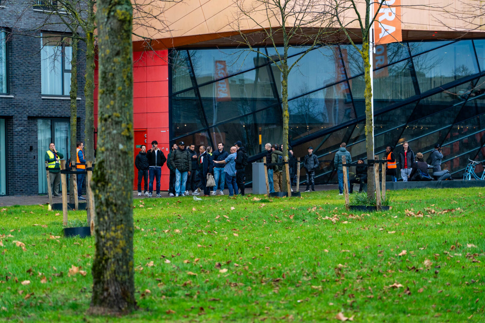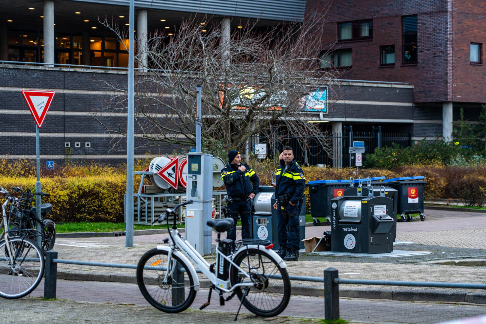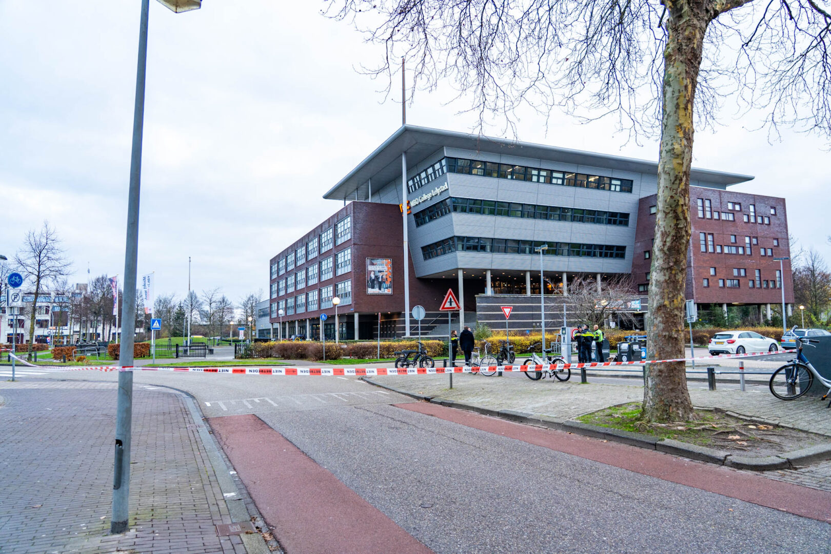 Leerlingen zijn opgevangen buiten bij de Angora. Ook de Kunstendreef en de Agorabaan zijn tijdelijk afgesloten voor het verkeer. Agenten bewaken de omgeving en houden mensen op afstand.