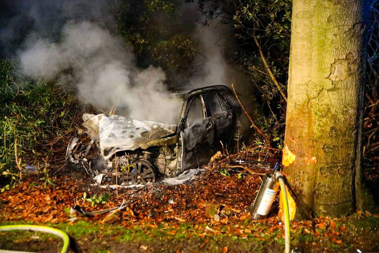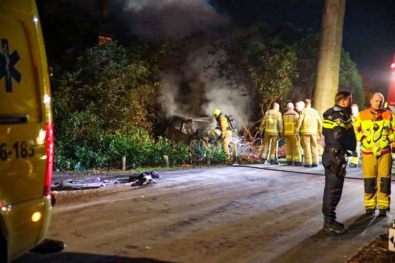 Zwaargewonde na zware crash; auto vliegt in brand na klap tegen boom