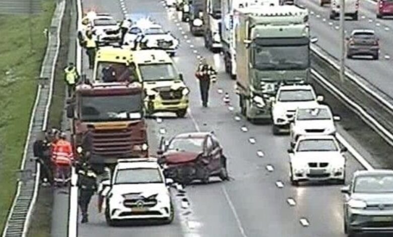 Twee rijstroken zijn afgesloten, waardoor de vertraging inmiddels is opgelopen tot ongeveer dertig minuten. Een ambulance is ter plaatse. Het is op dit moment niet bekend of er gewonden zijn gevallen. De berger zal binnenkort beginnen met de bergingswerkzaamheden.