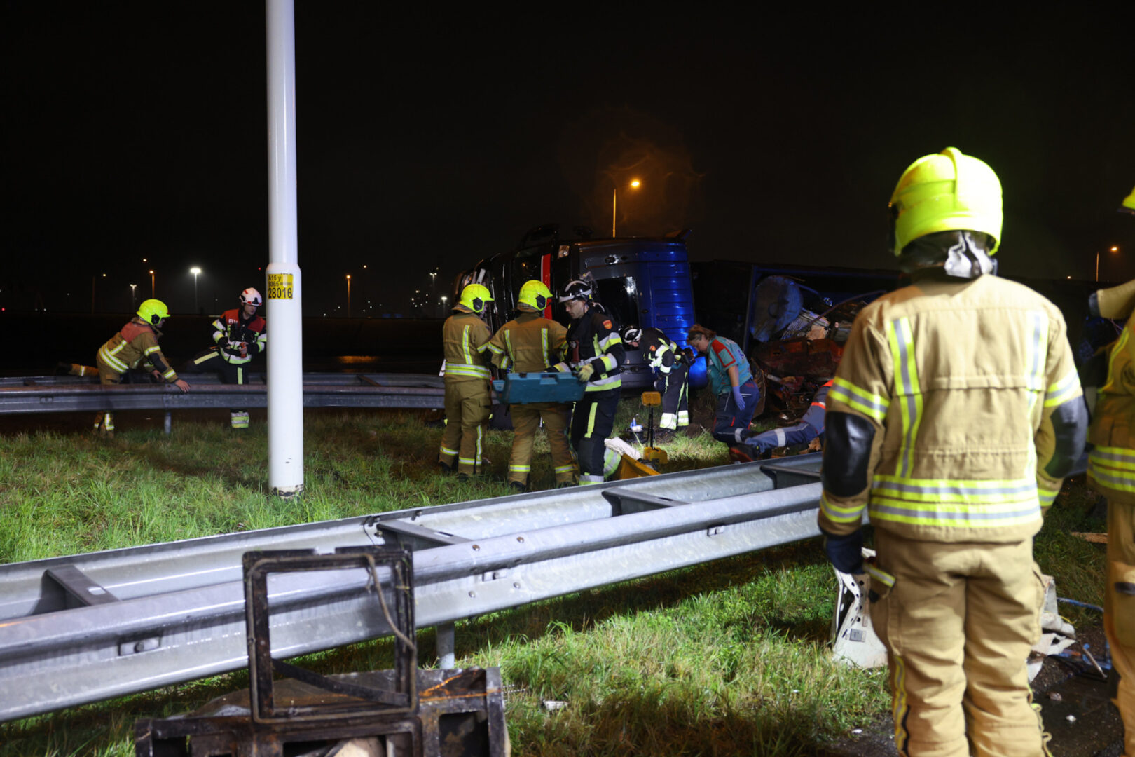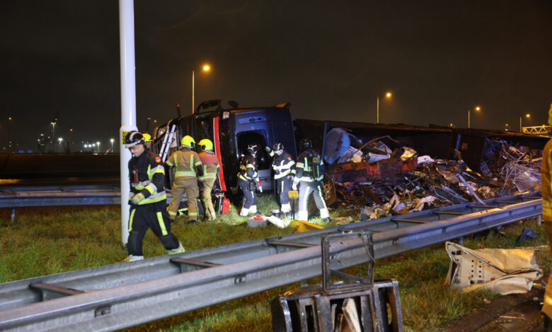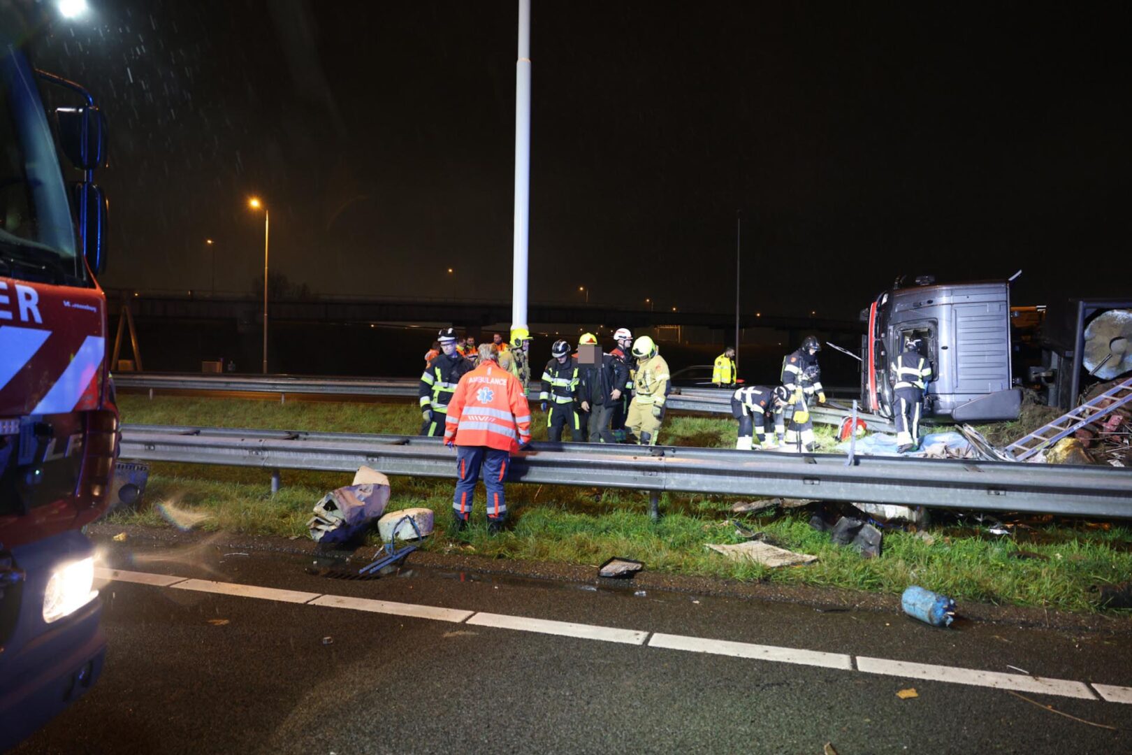 De chauffeur zat bekneld in de cabine en is door de brandweer bevrijd. Over zijn toestand is op dit moment nog niets bekend. De berging van de vrachtwagen en het opruimen van de lading staan gepland vanaf 10.00 uur, meldt Rijkswaterstaat.