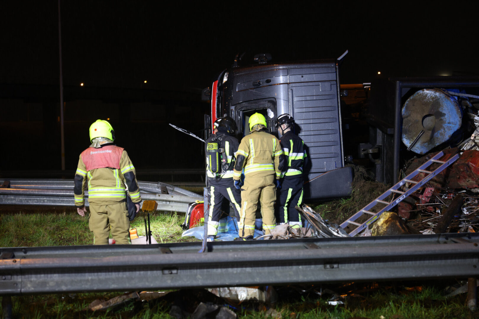 Snelweg dicht en 70 minuten file na ernstig ongeval; vrachtwagen vol schroot gekanteld
