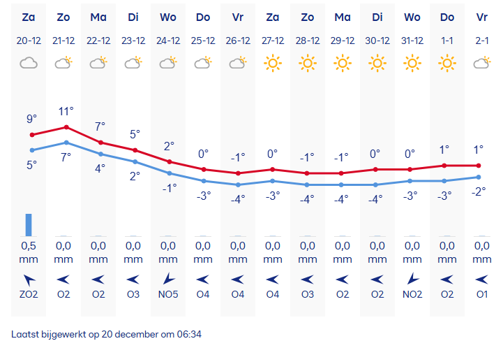 De dagen daarna en met name het weekend en het begin van de laatste week van 2025 verlopen droog, zonnig maar wel waterkoud met temperaturen van 0 tot -1 graden overdag. In de nachten kan het flink gaan vriezen met temperaturen variërend tussen de -2 en de -4 graden.