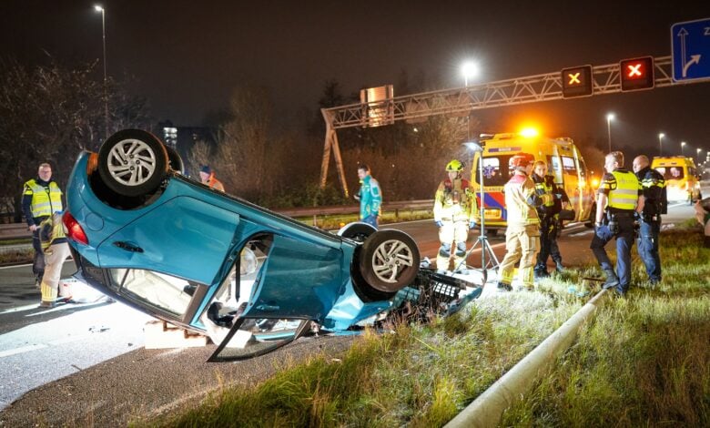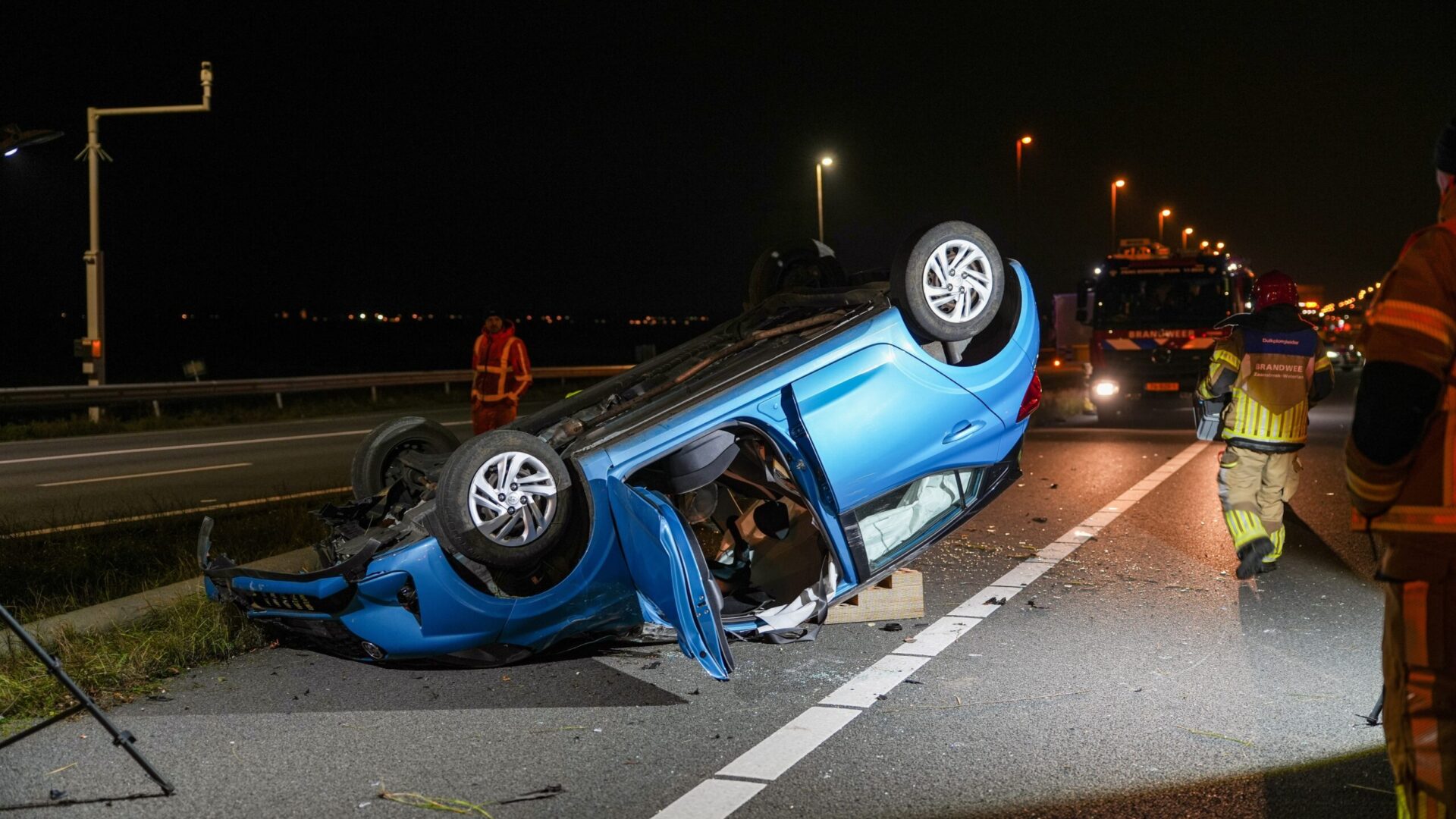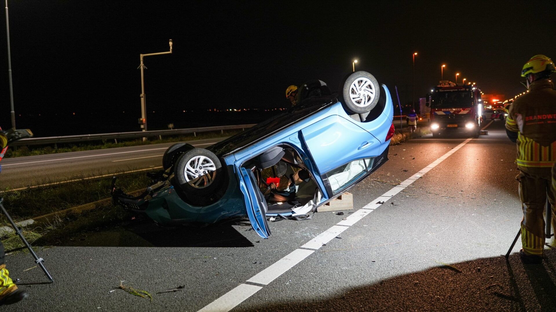 Een personenauto met daarin een oudere man en vrouw raakte door nog onbekende oorzaak van de weg en botste tegen een lantaarnpaal in de middenberm. Door de klap sloeg het voertuig over de kop.
