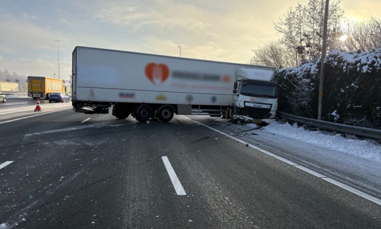 Vrachtwagen geschaard op snelweg, parallelbaan afgesloten