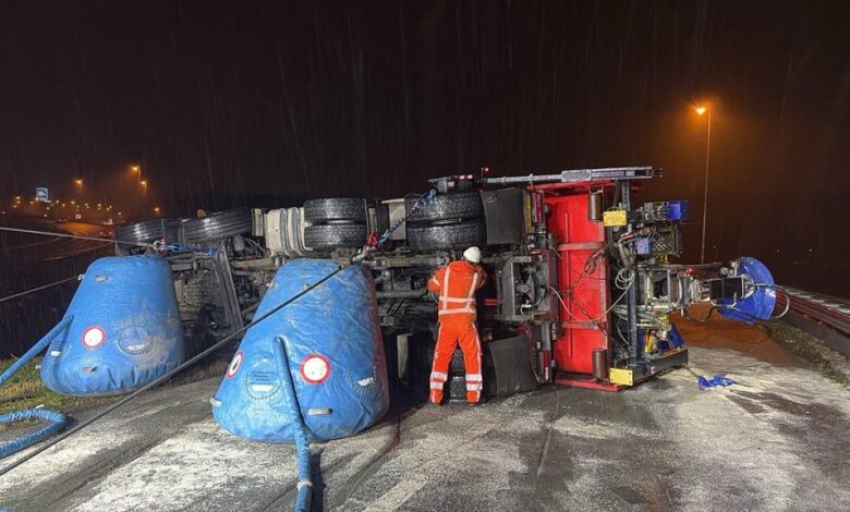 Spekgladde ochtendspits; strooiwagen gekanteld op snelweg