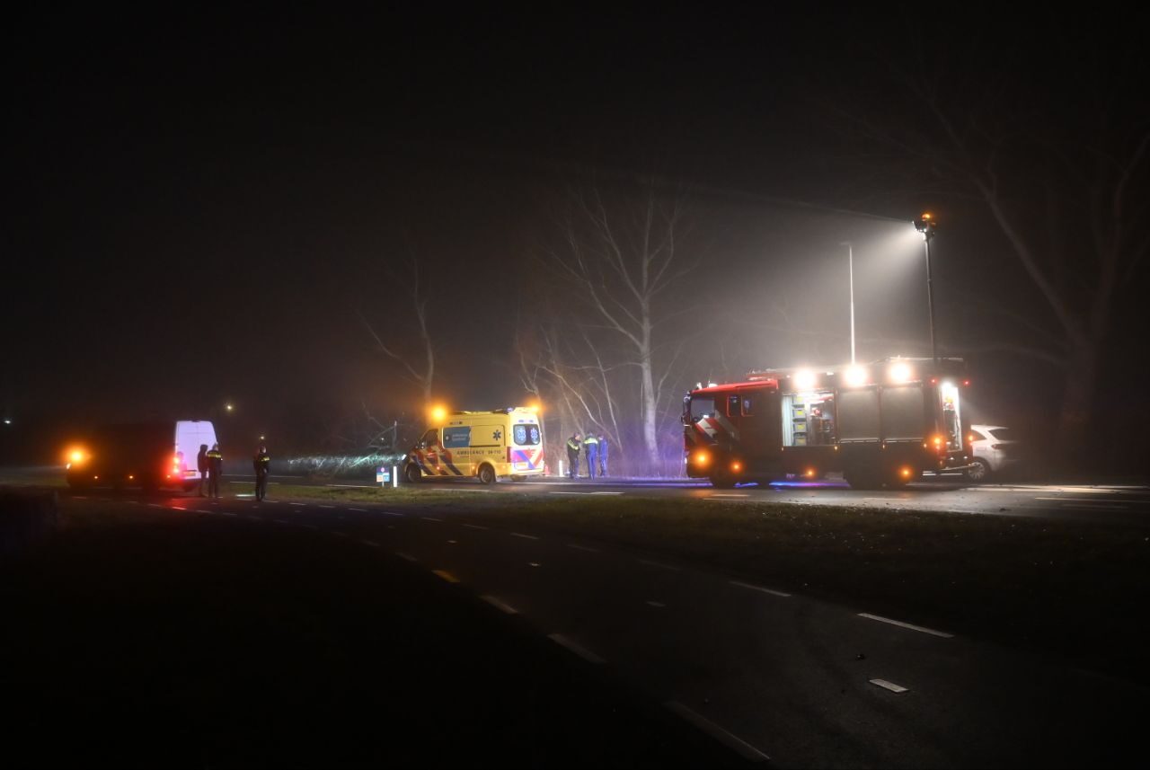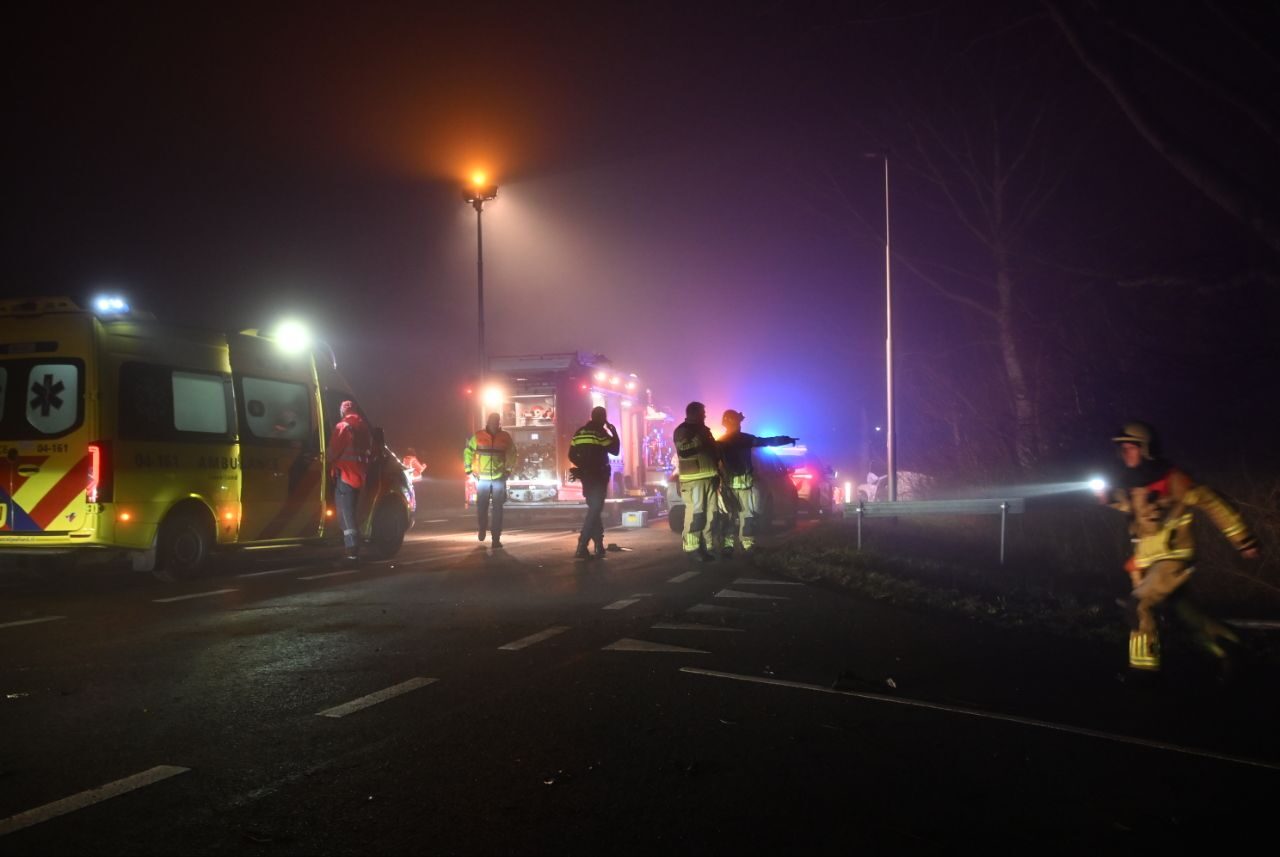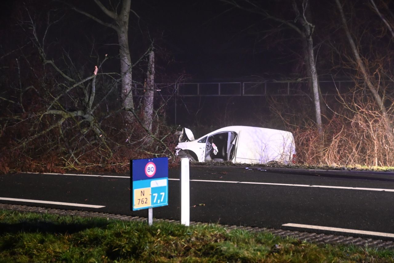 De voertuigen reden volgens de politie achter elkaar en zijn in de bocht rechtdoor gereden. Beide auto’s kwamen daarbij in de bosschage terecht. Een bestelauto botste tegen een boom, die door de impact doormidden brak.
