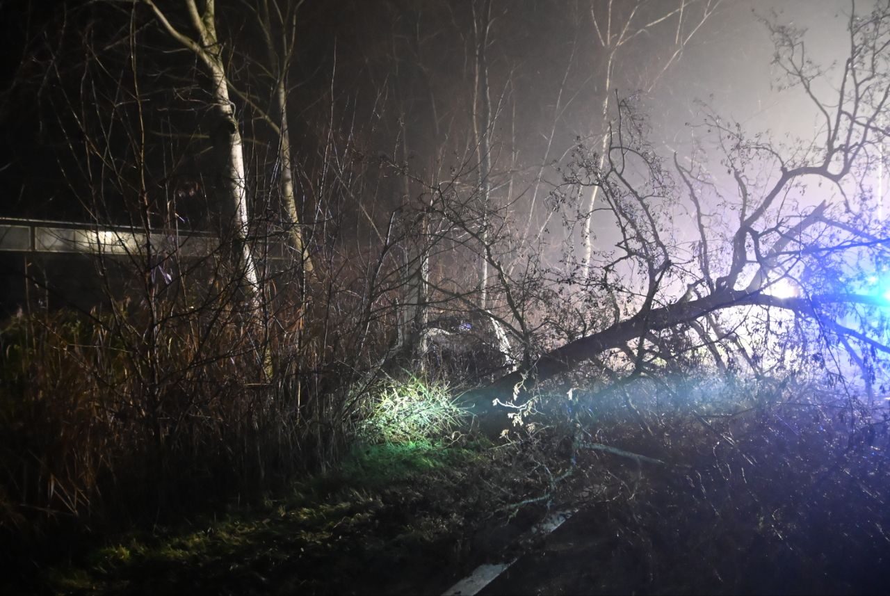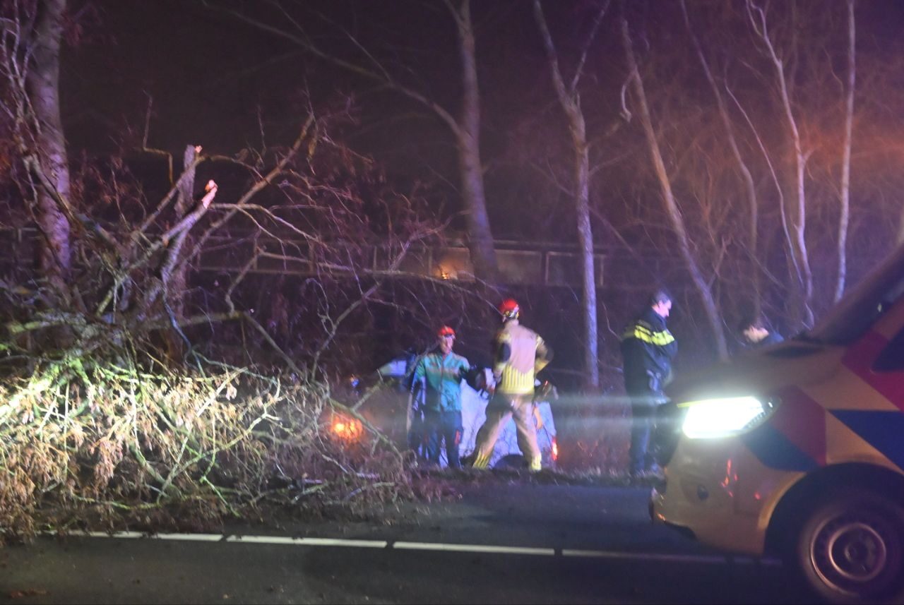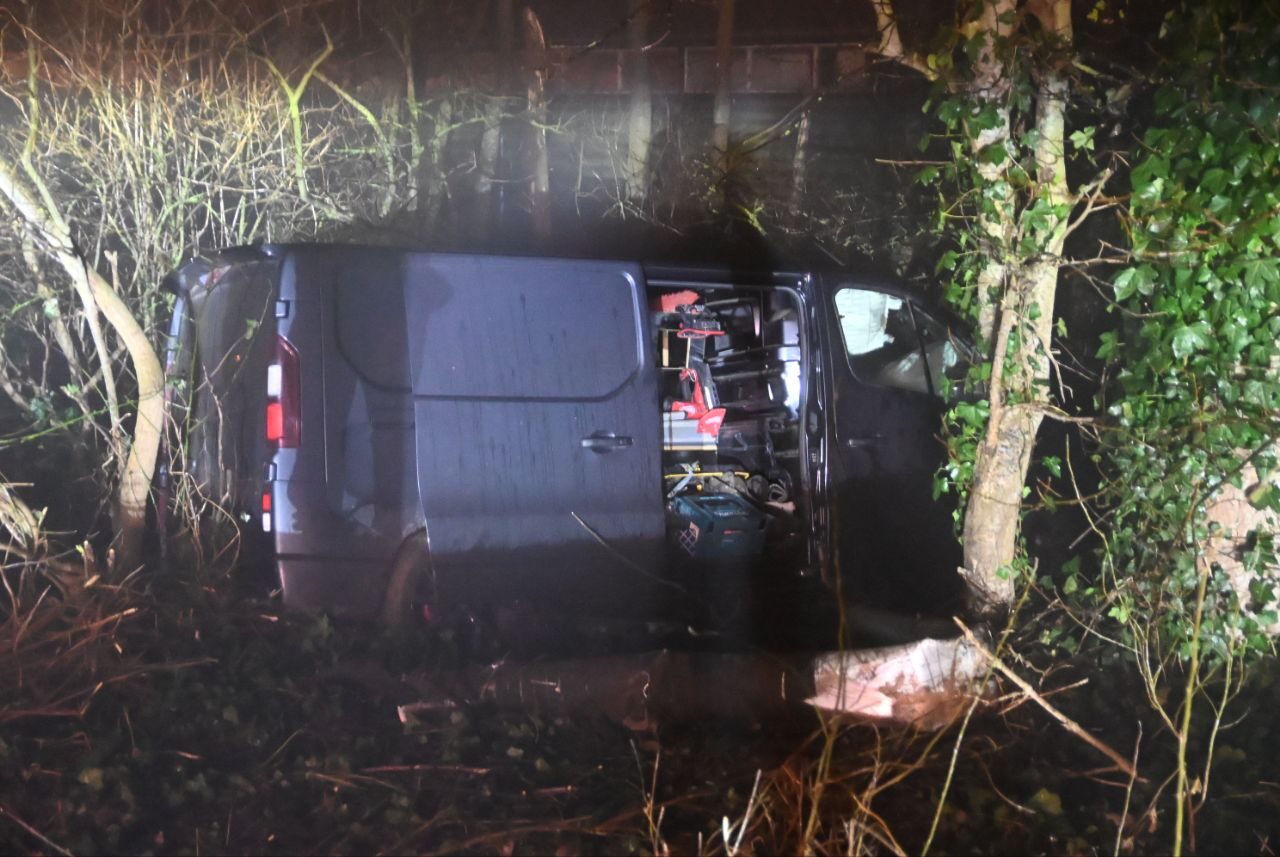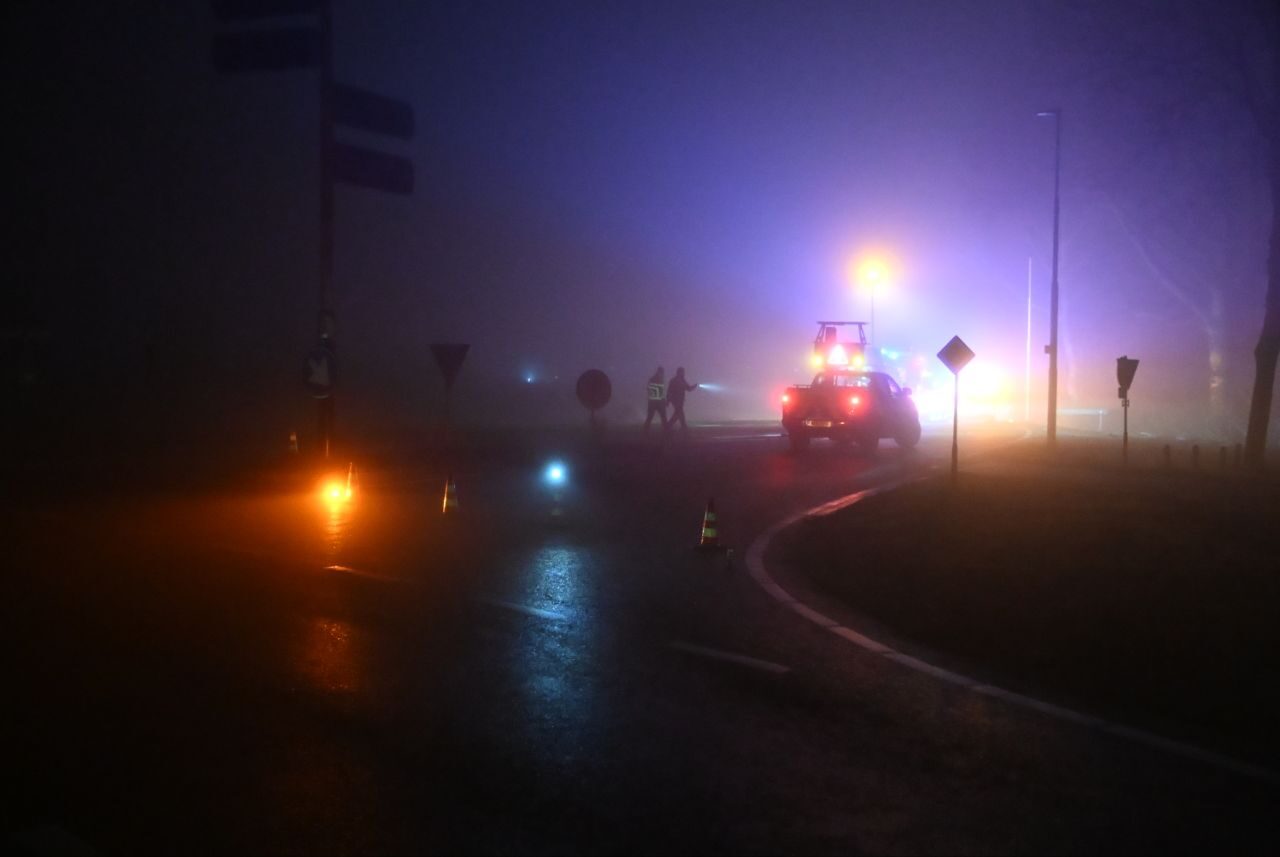 De voertuigen reden volgens de politie achter elkaar en zijn in de bocht rechtdoor gereden. Beide auto’s kwamen daarbij in de bosschage terecht. Een bestelauto botste tegen een boom, die door de impact doormidden brak.