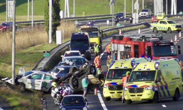 Snelweg dicht na ernstig ongeval met meerdere auto’s; auto op de kop belandt