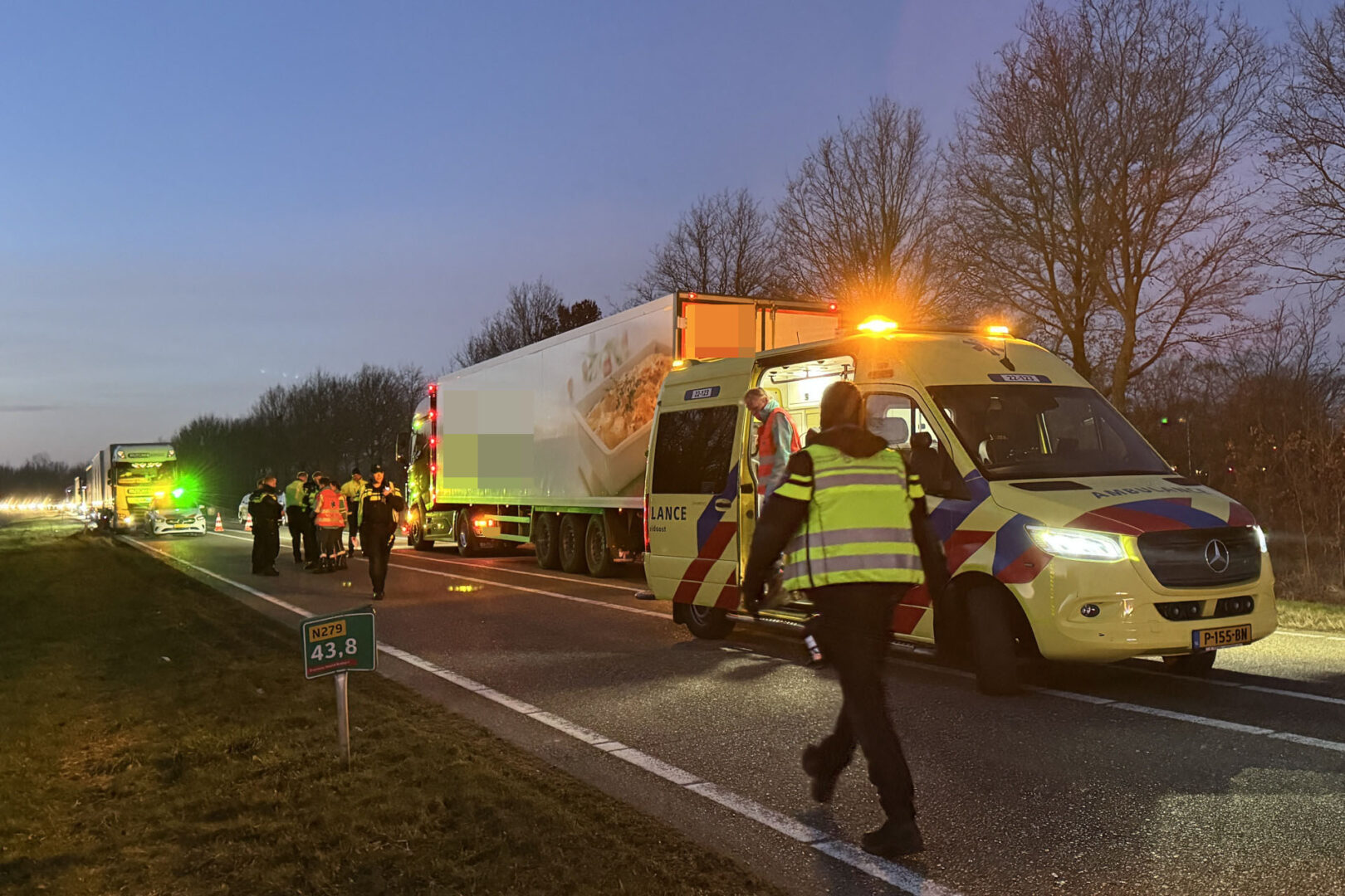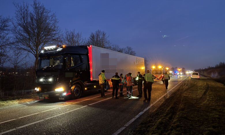 Een man is aangereden door een vrachtwagen en raakte zwaargewond. Hij is onder begeleiding van een trauma-arts naar het ziekenhuis vervoerd. De vrachtwagenchauffeur kwam met de schrik vrij. De vrachtwagen zal door een berger worden afgesleept.