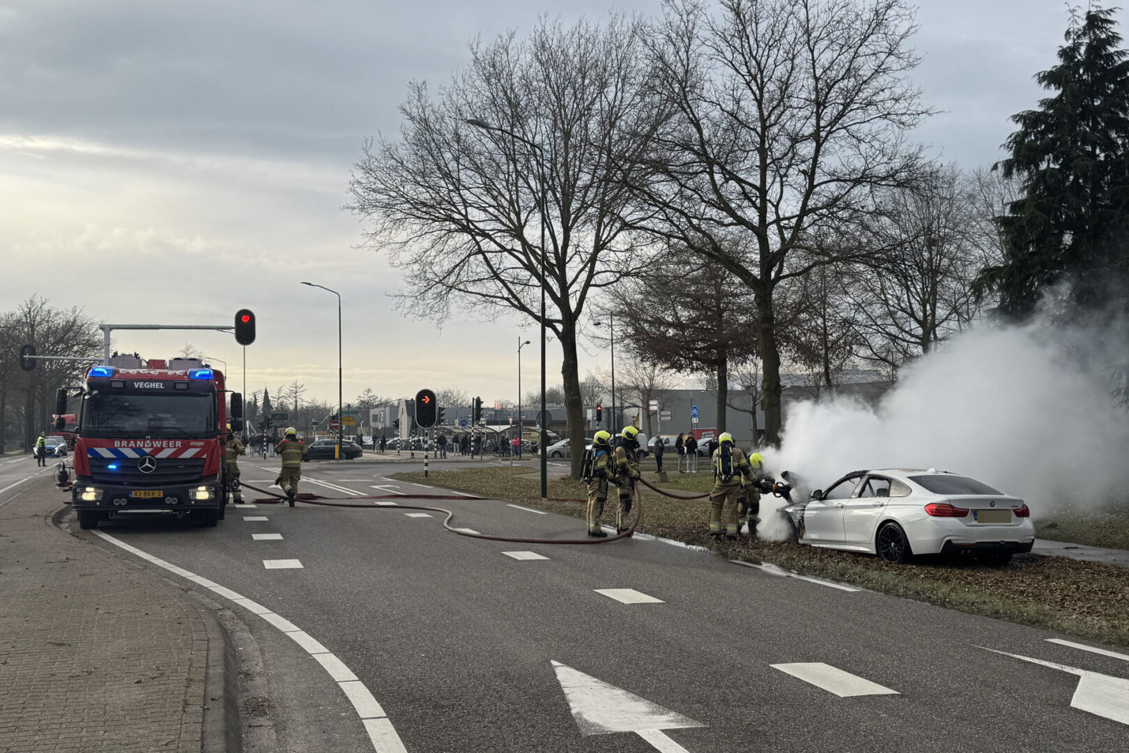 De brandweer werd rond 13:45 gealarmeerd voor de autobrand. Voor het stoplicht was de auto in brand gevlogen. De bestuurder wist er op tijd uit te komen. De auto ging volledig verloren bij de brand. De brandweer heeft de weg tijdelijk afgesloten om de brand te kunnen blussen.