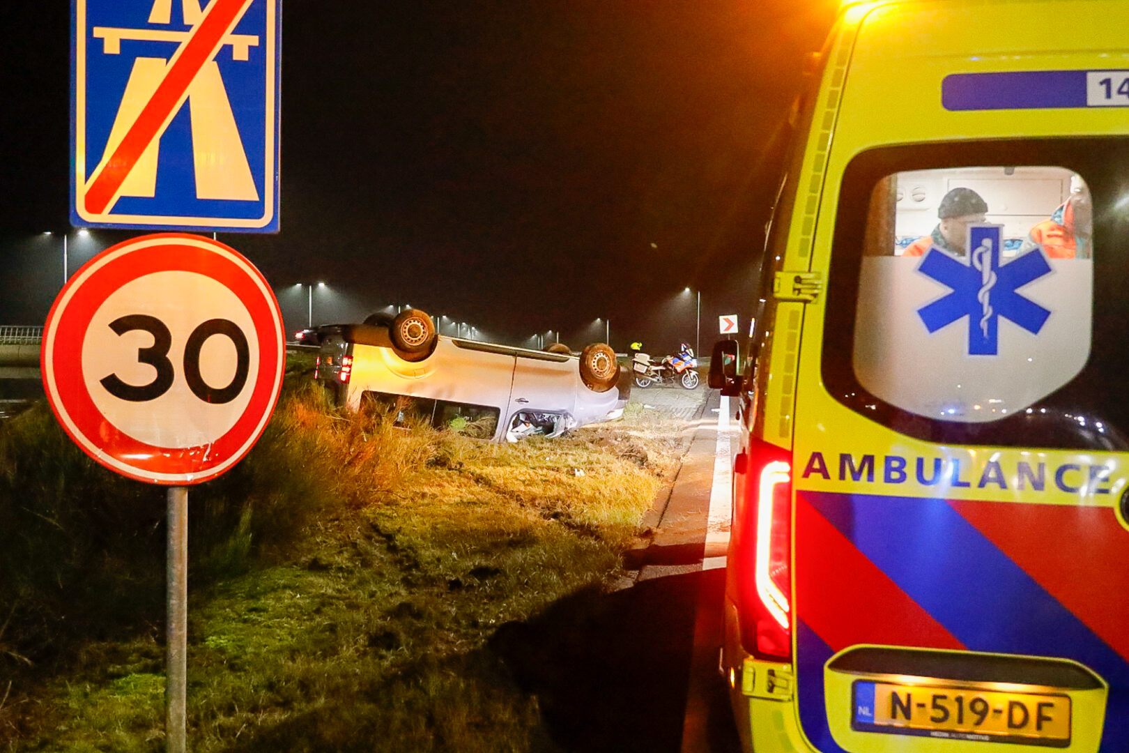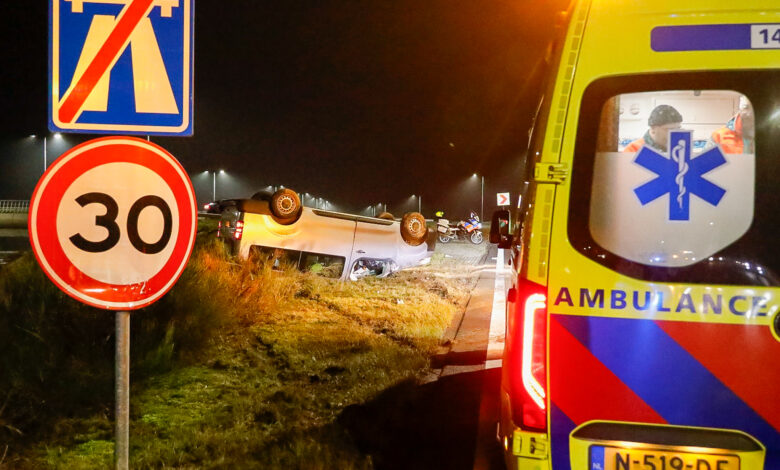 De afrit is vanwege het ongeval tijdelijk afgesloten. Een bergingsbedrijf zal het busje weer overeind zetten en afslepen.