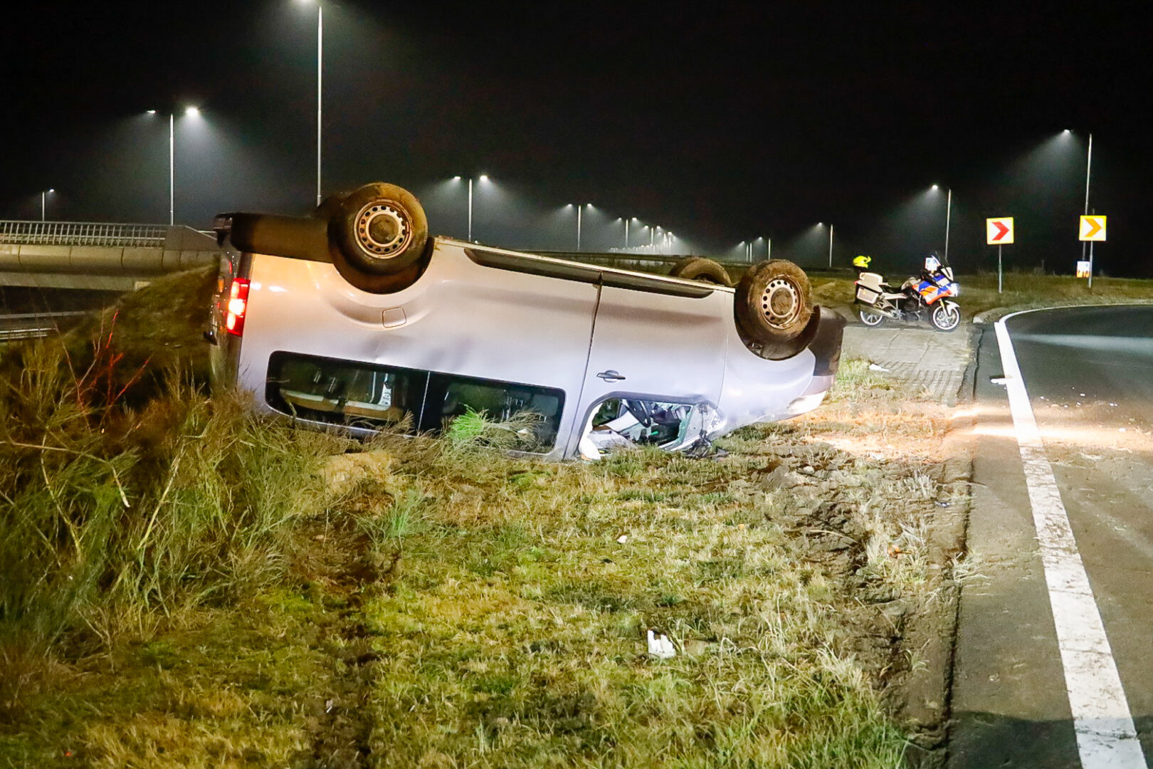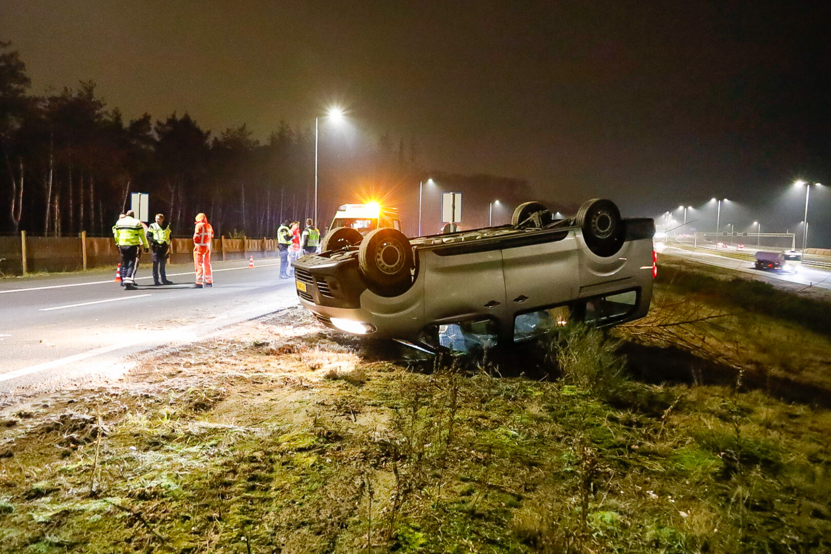 Woensdagavond rond 20.25 uur is op de afrit van de A27 bij Hilversum een bestelbusje van Defensie op zijn dak in de berm beland.