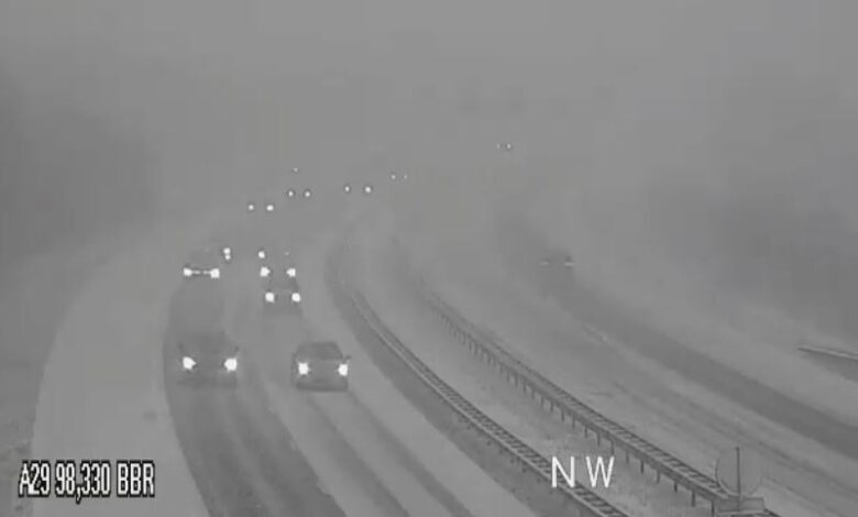 Op meerdere plekken kleurt het asfalt wit. Op de A29 is inmiddels een duidelijk besneeuwd wegdek te zien. Strooiwagens zijn volop in actie om de wegen begaanbaar te houden.
