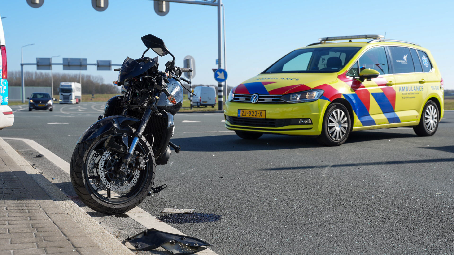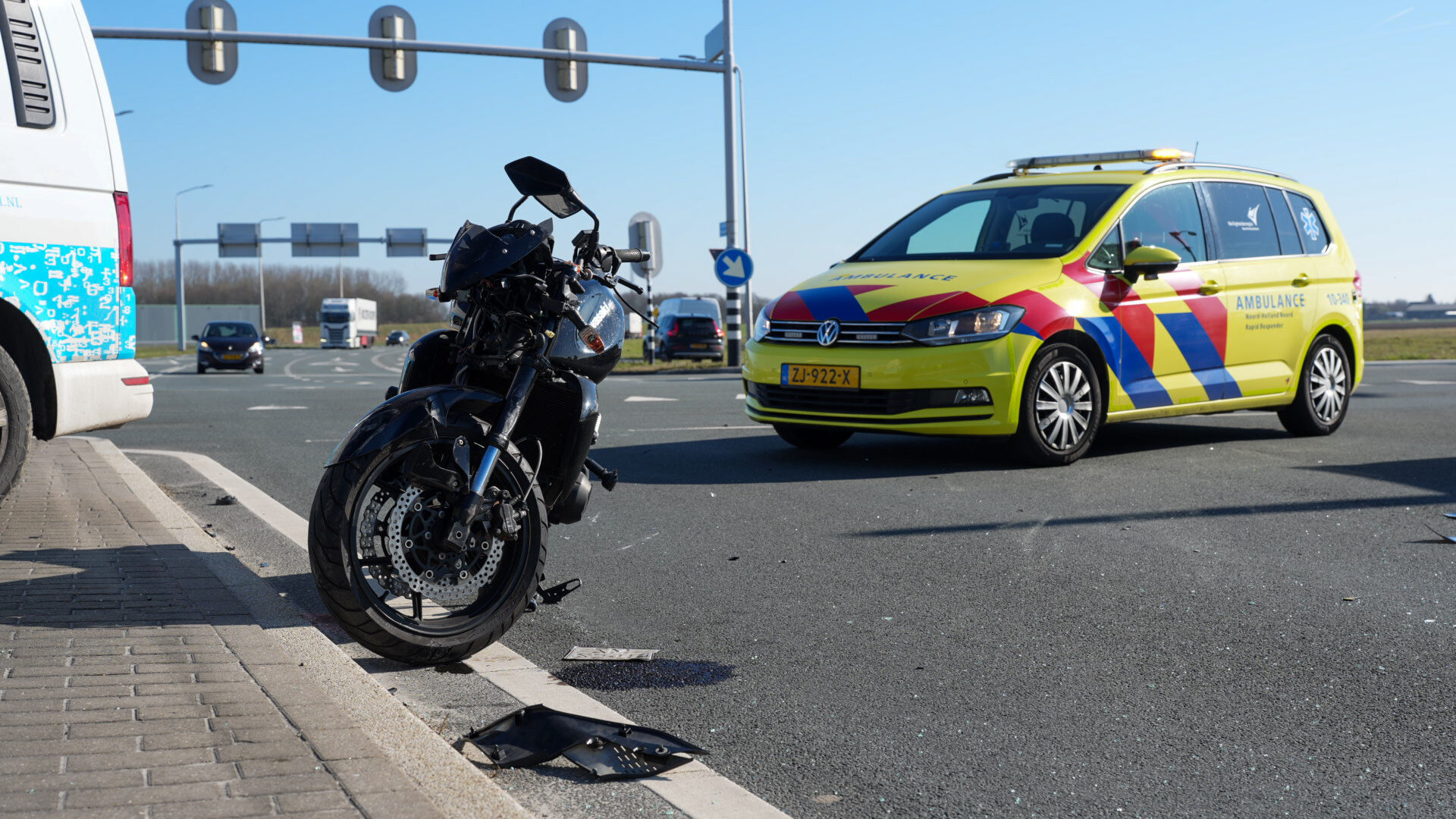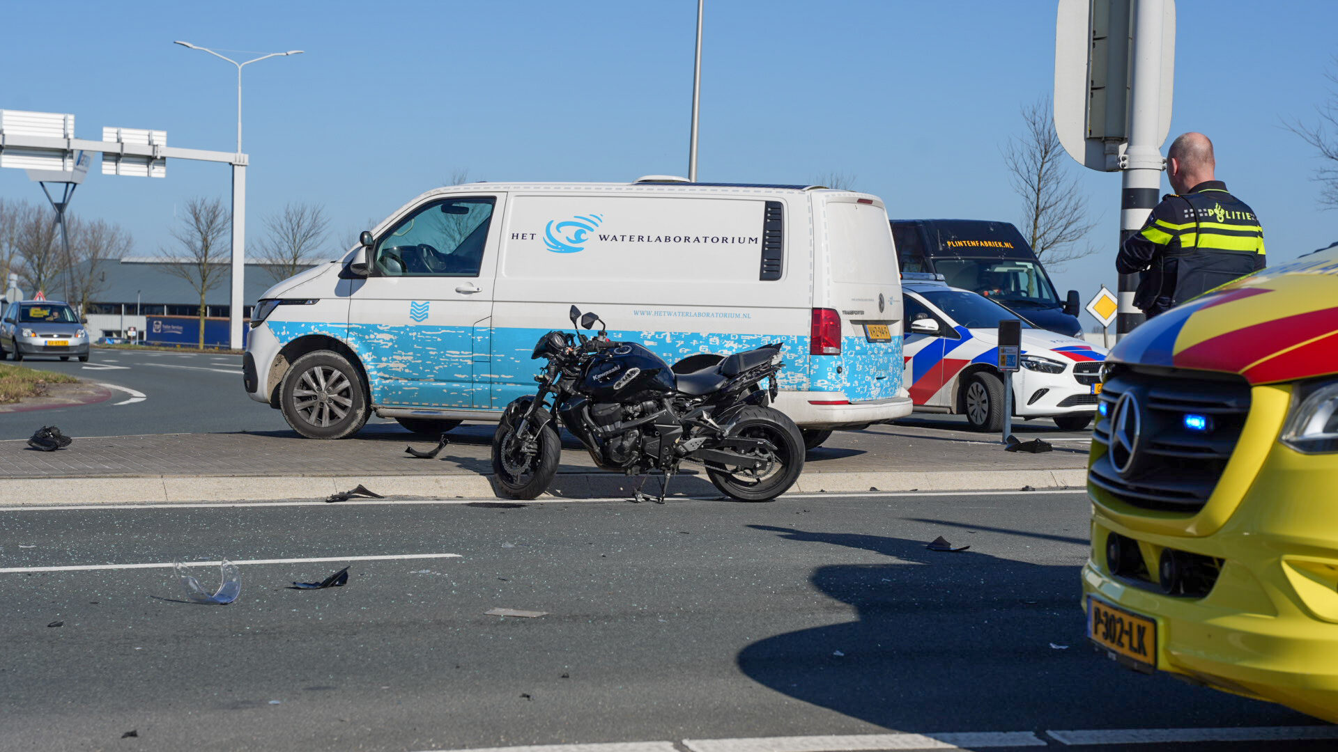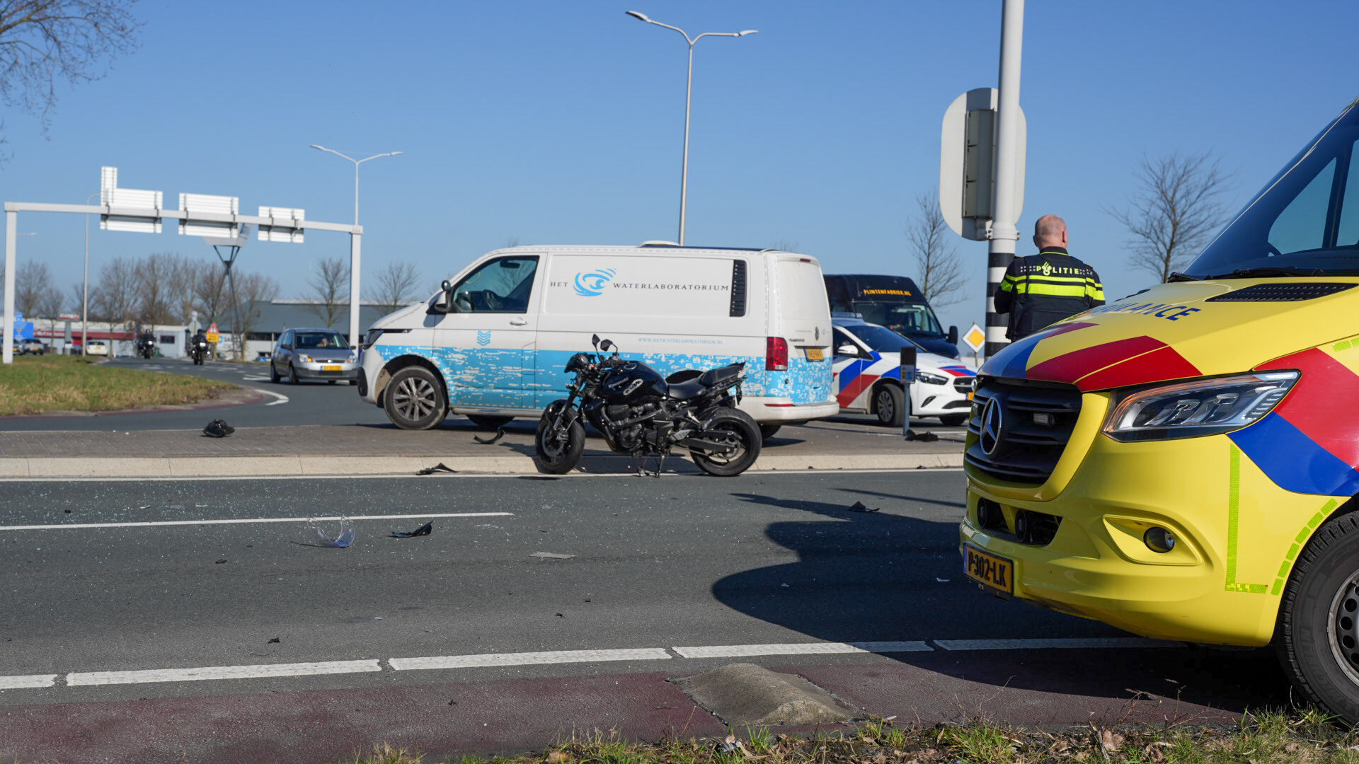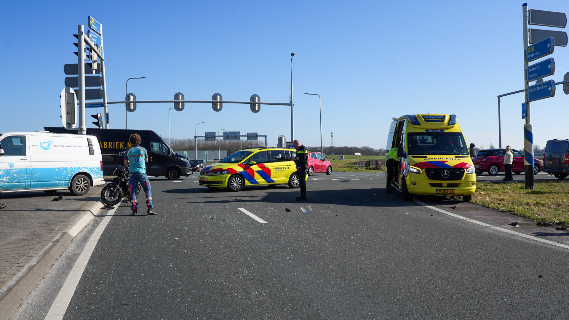 Een motorrijder kwam op de kruising in botsing met een personenauto. Bij het ongeluk botste de motorrijder in de zijkant van de personenauto en kwam daarna ten val. Bestuurders die het ongeval hebben zien gebeuren verleende direct eerste hulp.