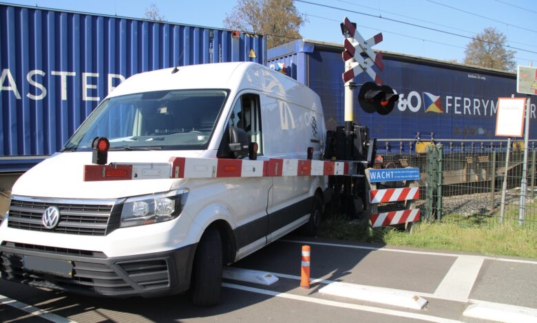 Bij de spoorwegovergang botste een goederentrein op een bestelbus die over het fietspad reed. Door de klap liep het busje aanzienlijke schade op.