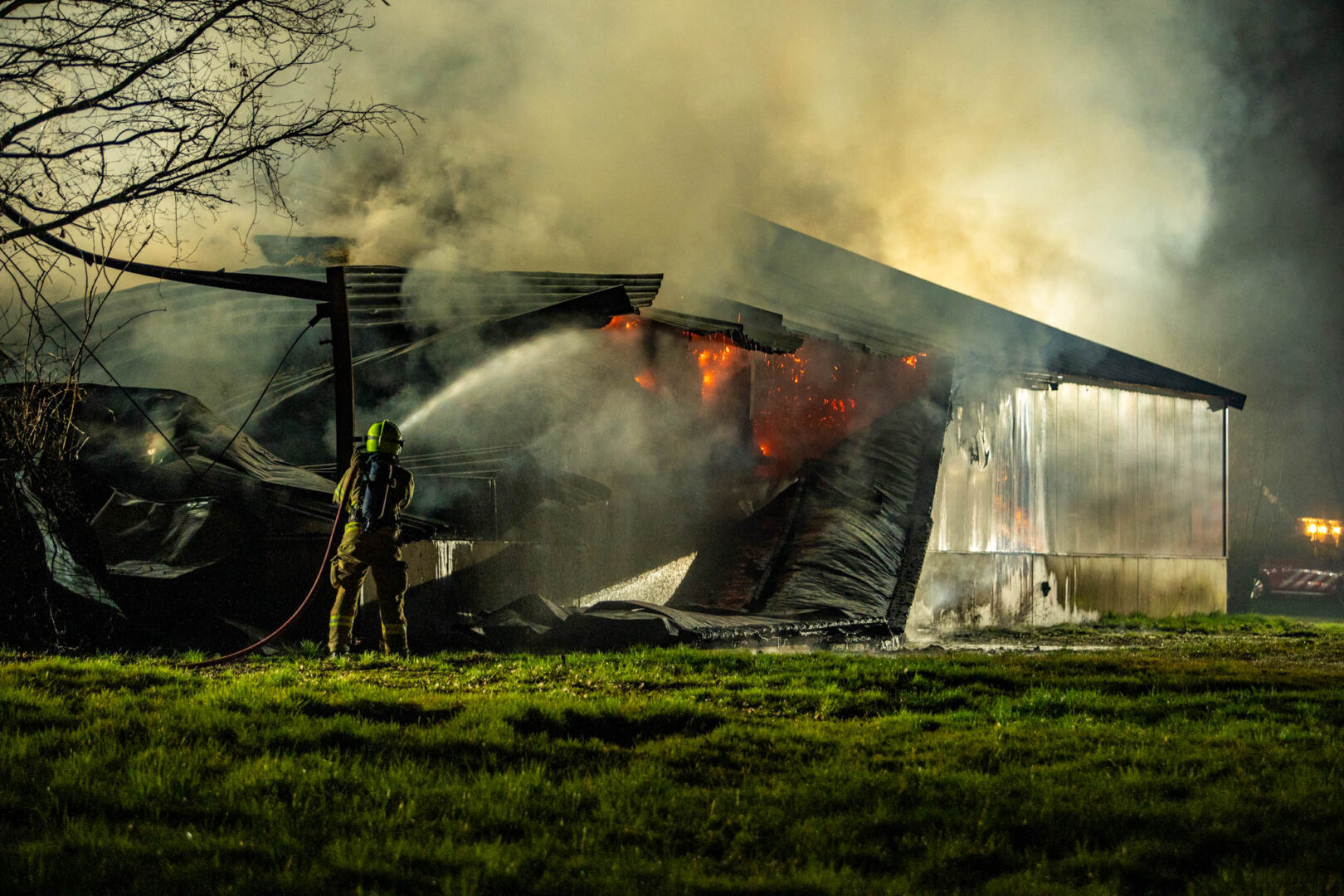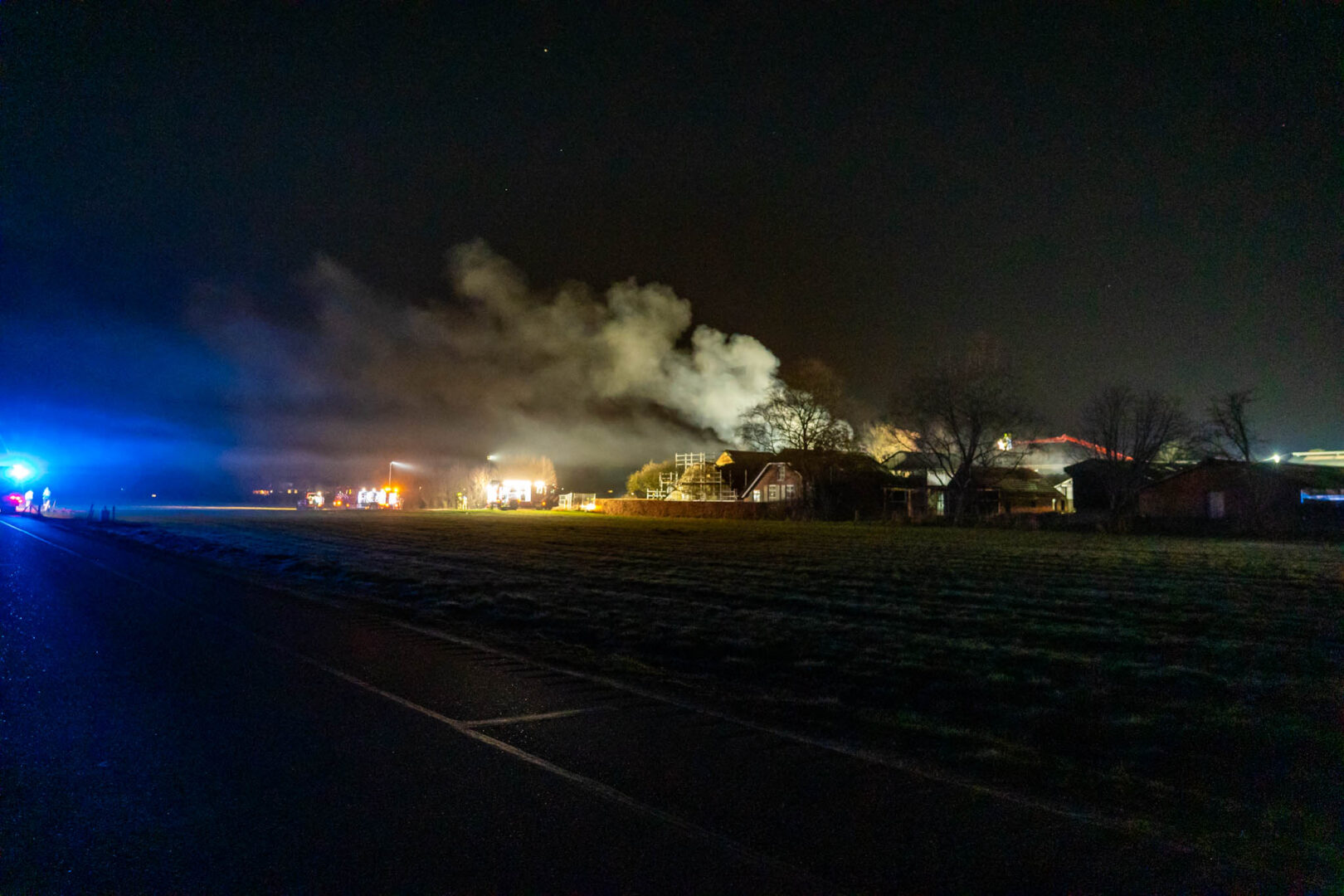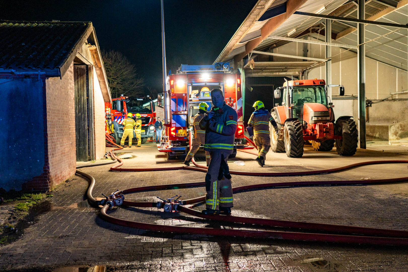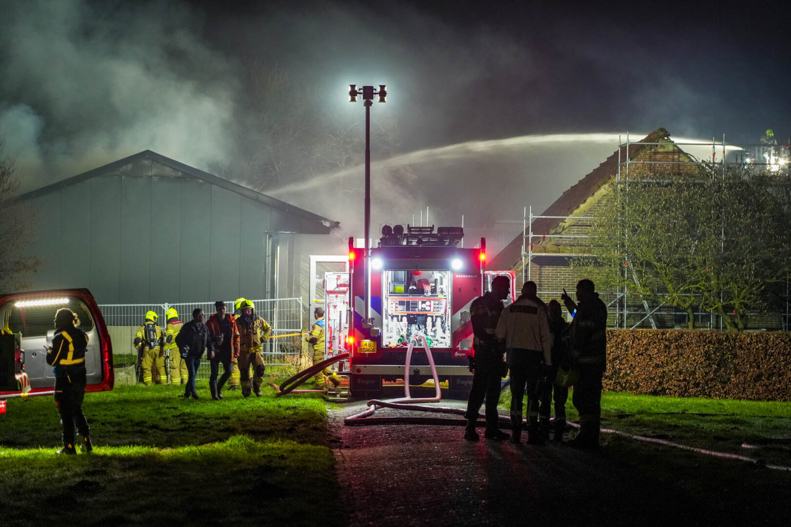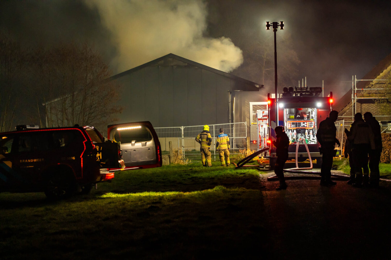 De brand werd rond 21.15 uur gemeld door twee voorbijgangers. Zij zagen op afstand hoe de vlammen uit het dak van een grote kapschuur sloegen en alarmeerden direct de hulpdiensten. De brandweer schaalde al snel op naar het sein ‘zeer grote brand’ en zette meerdere eenheden in. In totaal kwamen vier blusvoertuigen, twee waterwagens en een hoogwerker ter plaatse om het vuur te bestrijden.