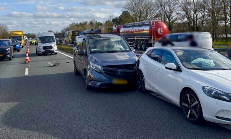 Door het ongeval is één rijstrook afgesloten om hulpdiensten en bergers de ruimte te geven voor de afhandeling. Drie van de betrokken voertuigen worden afgesleept.