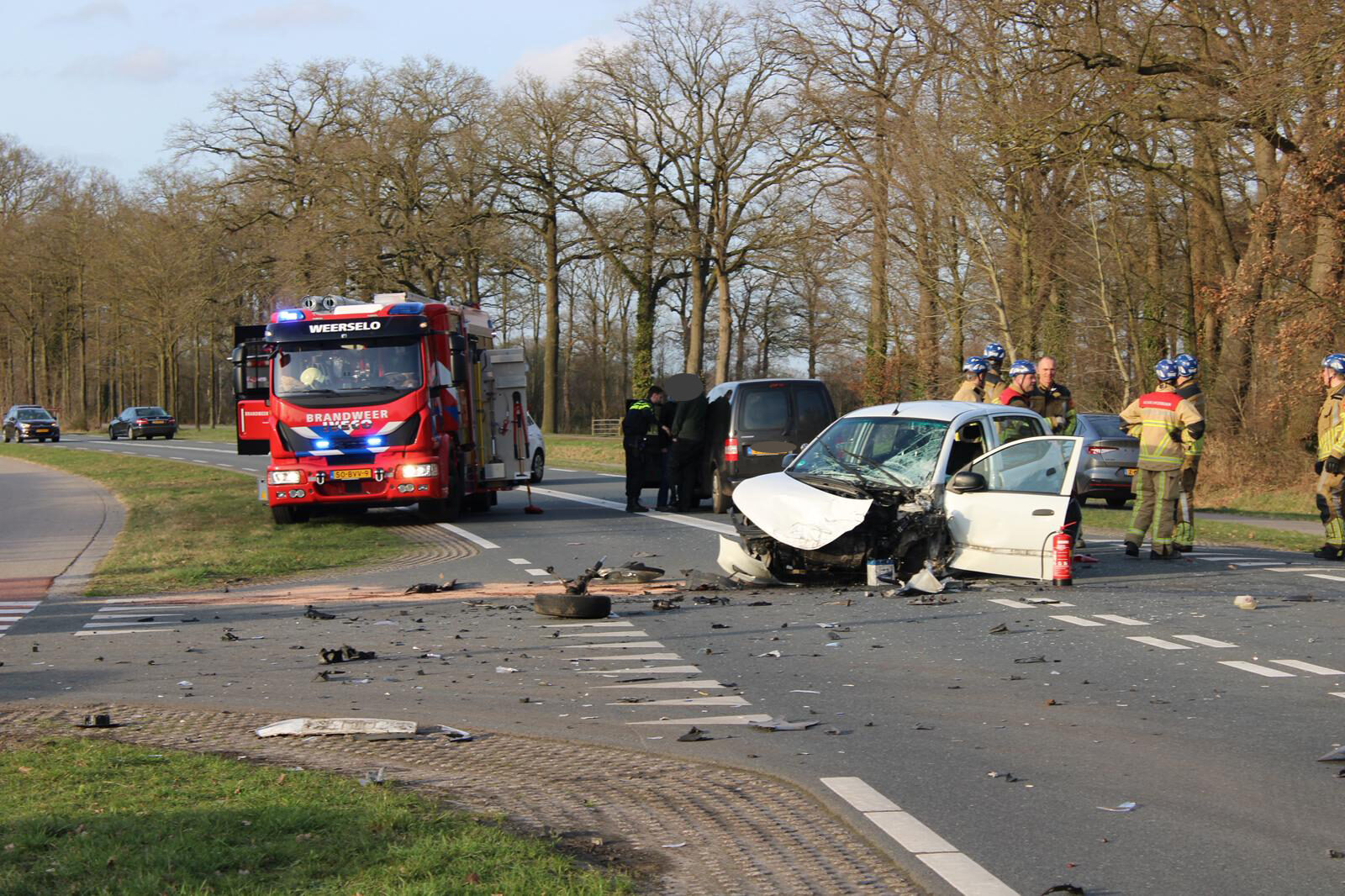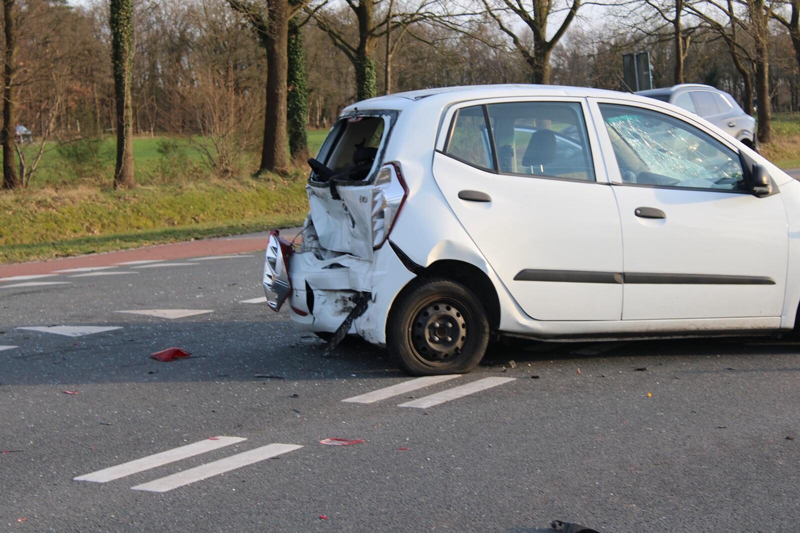 Door het ongeval ligt de weg en het kruispunt bezaaid met onderdelen. Zo ligt er een afgebroken wiel op de weg. De kruising blijft de komende tijd afgesloten voor de hulpverlening, de berging en het daaropvolgende politieonderzoek.