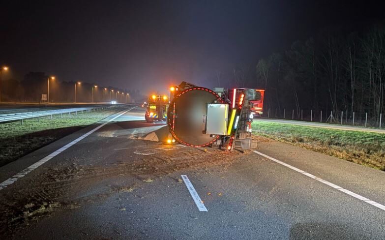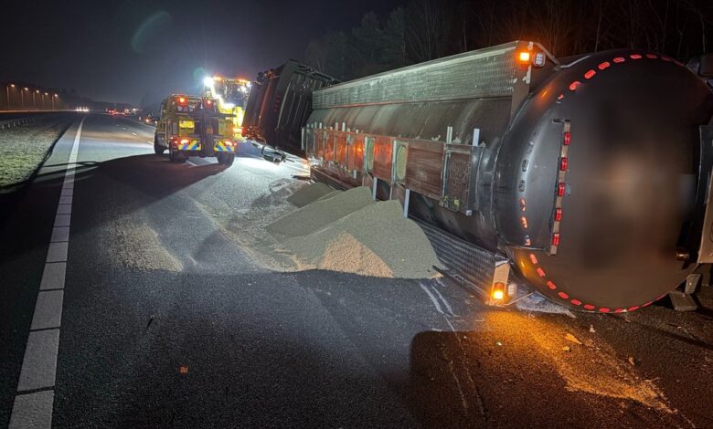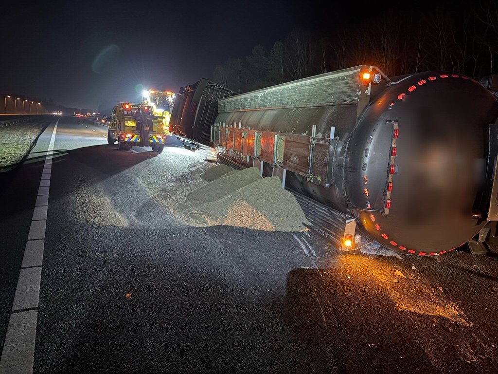 Een vrachtwagen geladen met 28 ton varkensmeel is in de nacht van zondag op maandag rond 04.00 uur gekanteld op de A67 bij Hapert, in de richting van Eindhoven. Het ongeval zorgt voor flinke verkeershinder en de afhandeling zal naar verwachting tot 12.00 uur duren, aldus Rijkswaterstaat.