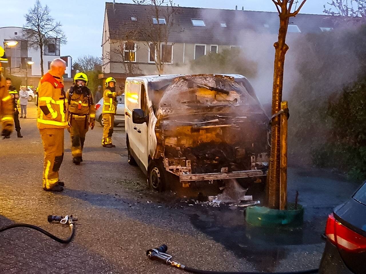 Een bestelbus is dinsdagochtend rond 06.35 uur volledig uitgebrand aan de Marie Koenenstraat in Apeldoorn.