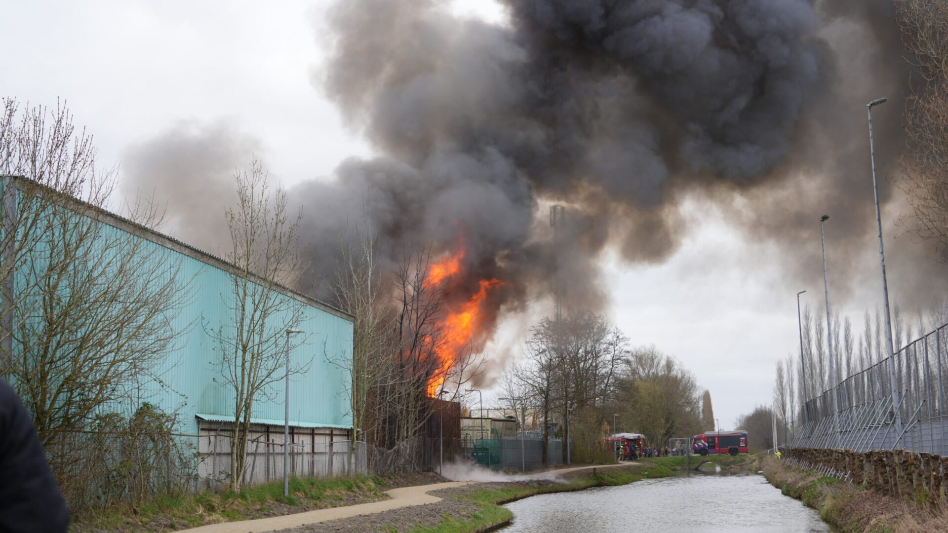 Zeer grote uitslaande brand met grote zwarte rookwolken op bedrijventerrein, NL-Alert verstuurd