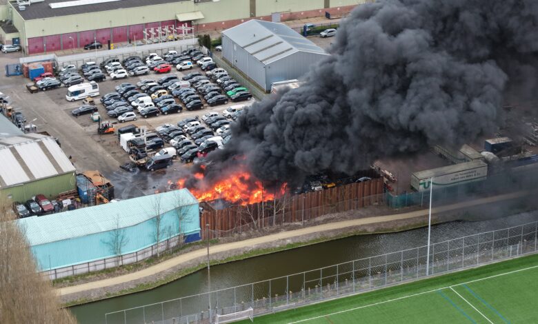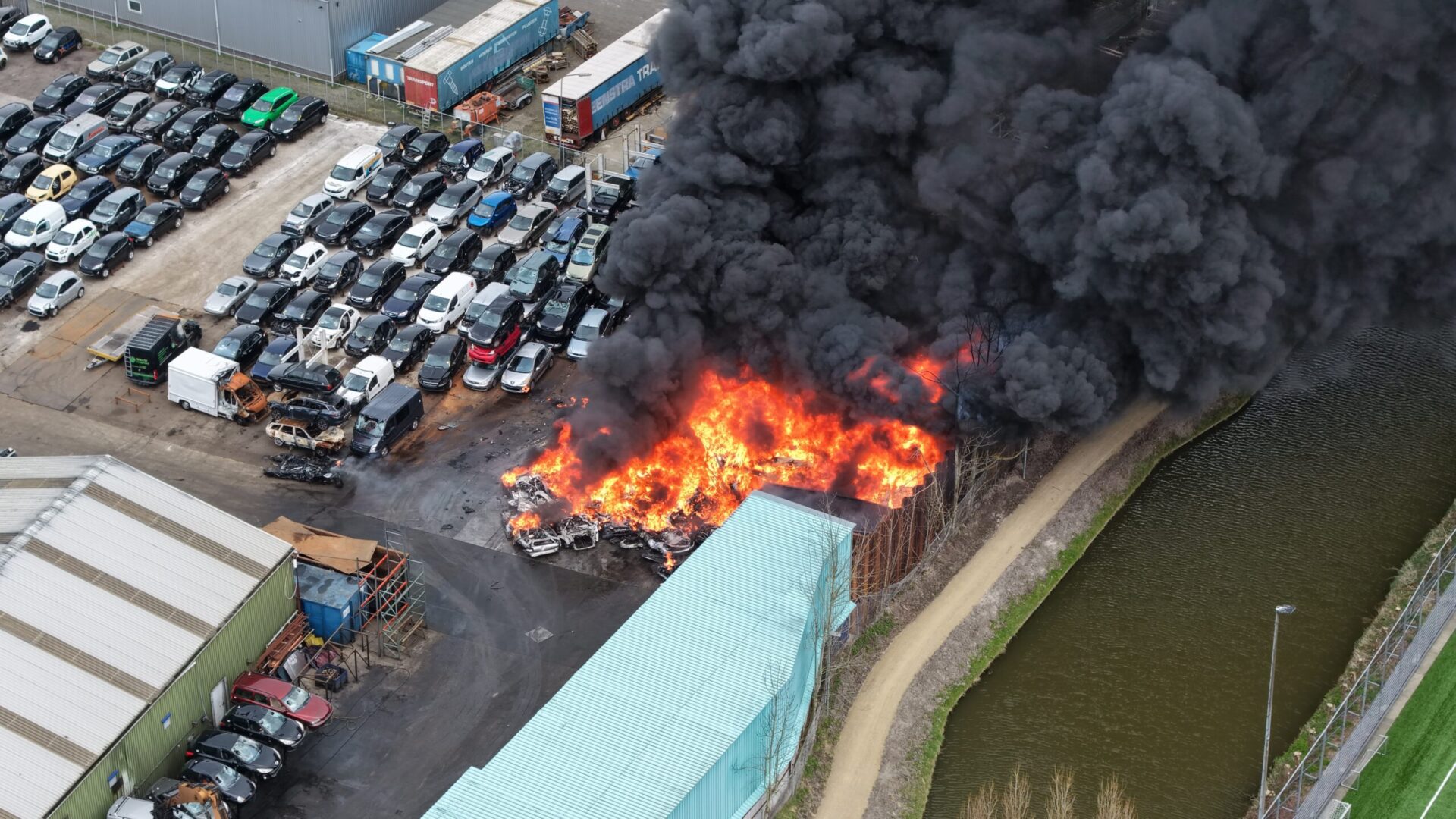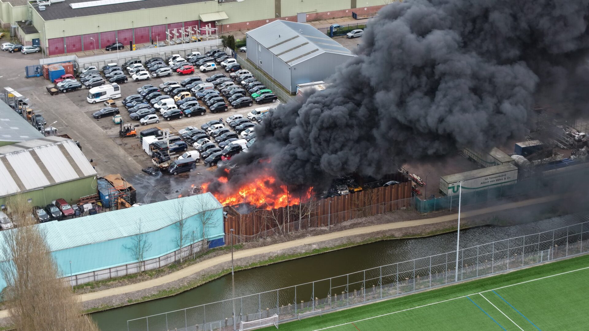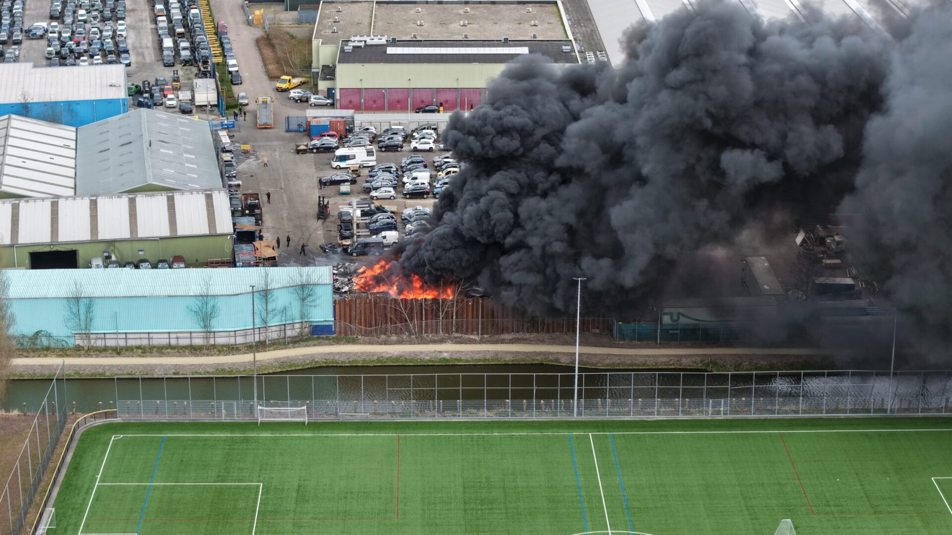 Achter op het terrein staan meerdere auto’s in brand. De brandweer is met veel materieel uitgerukt om het vuur onder controle te krijgen. Grote zwarte rookwolken stijgen op vanaf het terrein en zijn in de omgeving goed zichtbaar.