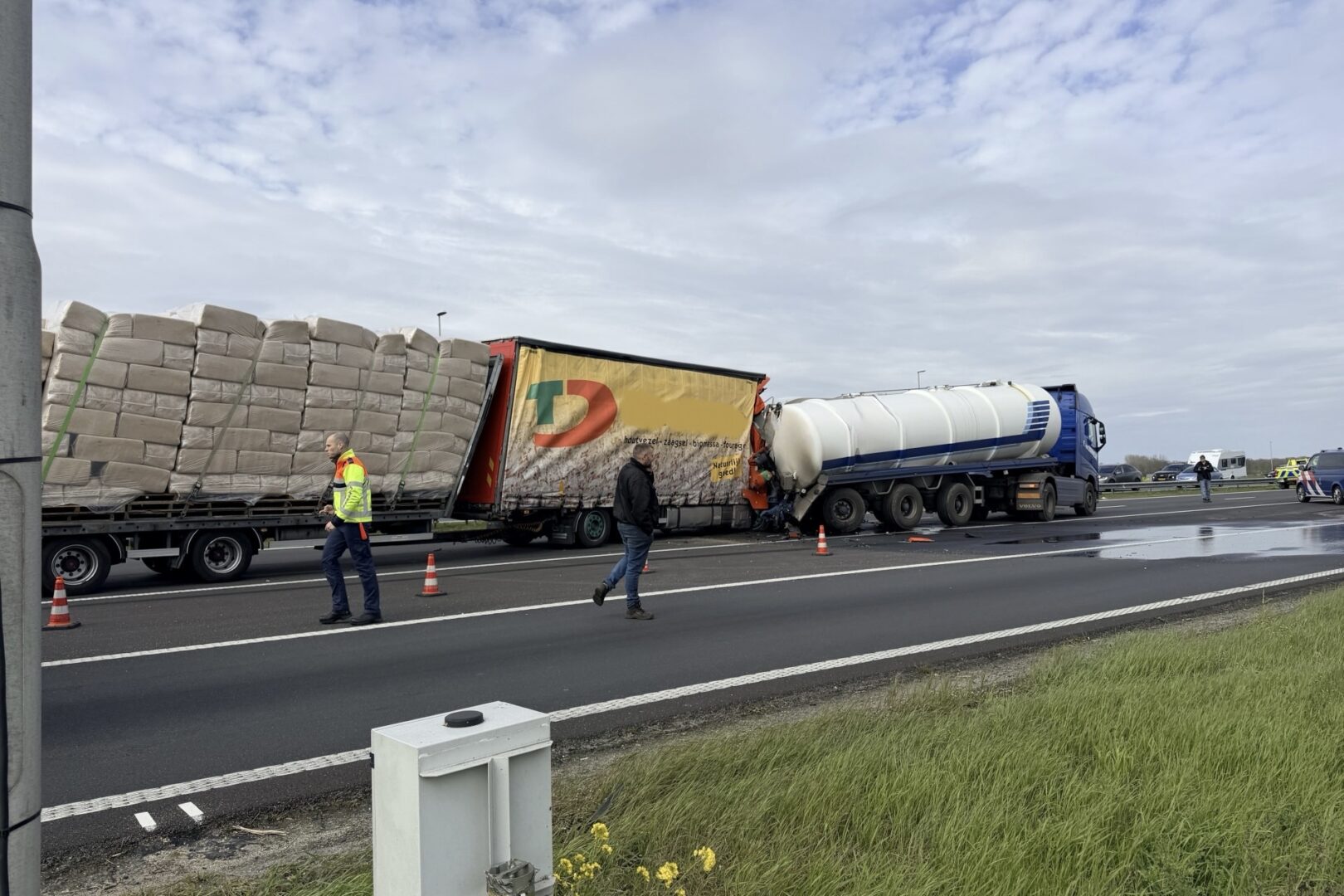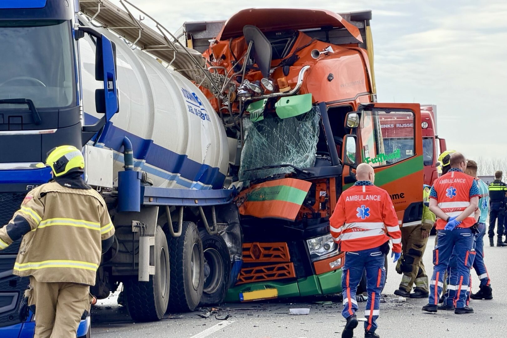Tevens lekt de mest op de rijbaan en het asfalt moet dus worden schoongemaakt. Ondanks de grote impact is het bij materiële schade gebleven.