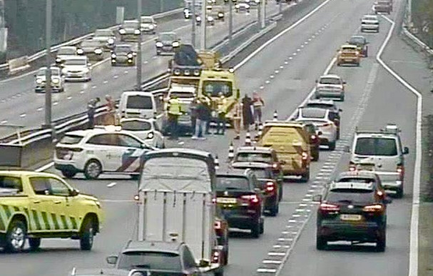 Door het incident zijn twee rijstroken afgesloten, waardoor het verkeer vertraging oploopt. Een ambulance is ter plaatse om een van de betrokkenen na te kijken. Of er iemand gewond is, is nog niet bekend.