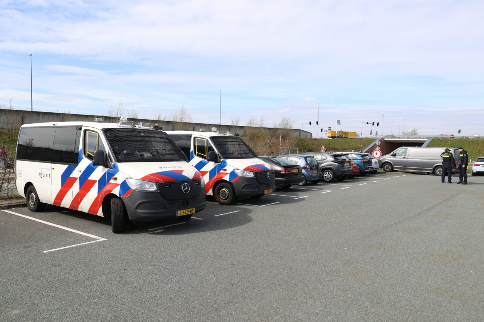 Meerdere busjes van de Mobiele Eenheid staan opgesteld bij de parkeerplaats aan de Papelaan. Leden van de eenheid doorzoeken te voet de bermen in de omgeving van de parkeerplaats.