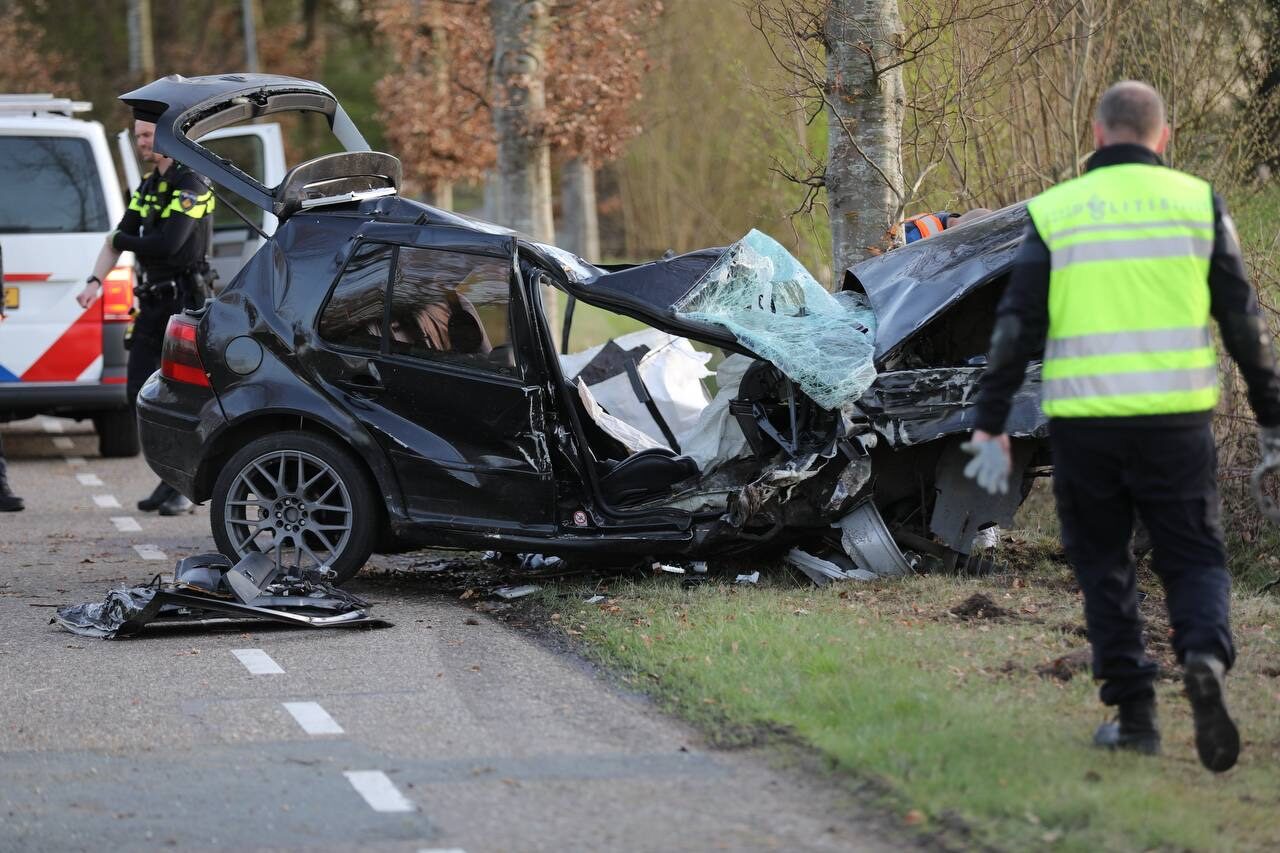De auto raakte door nog onbekende oorzaak van de weg en botste tegen een boom, die door de impact om viel.